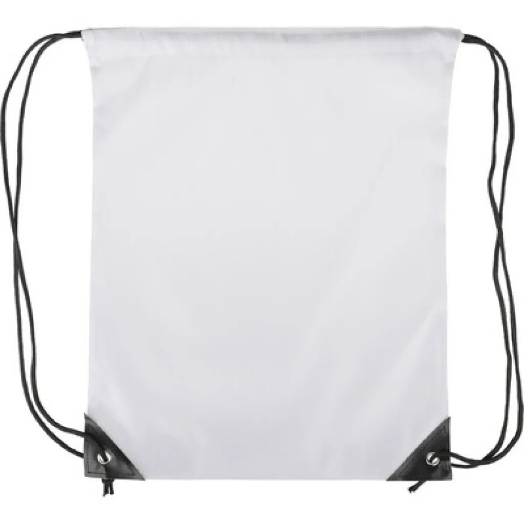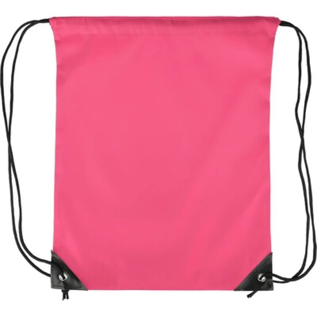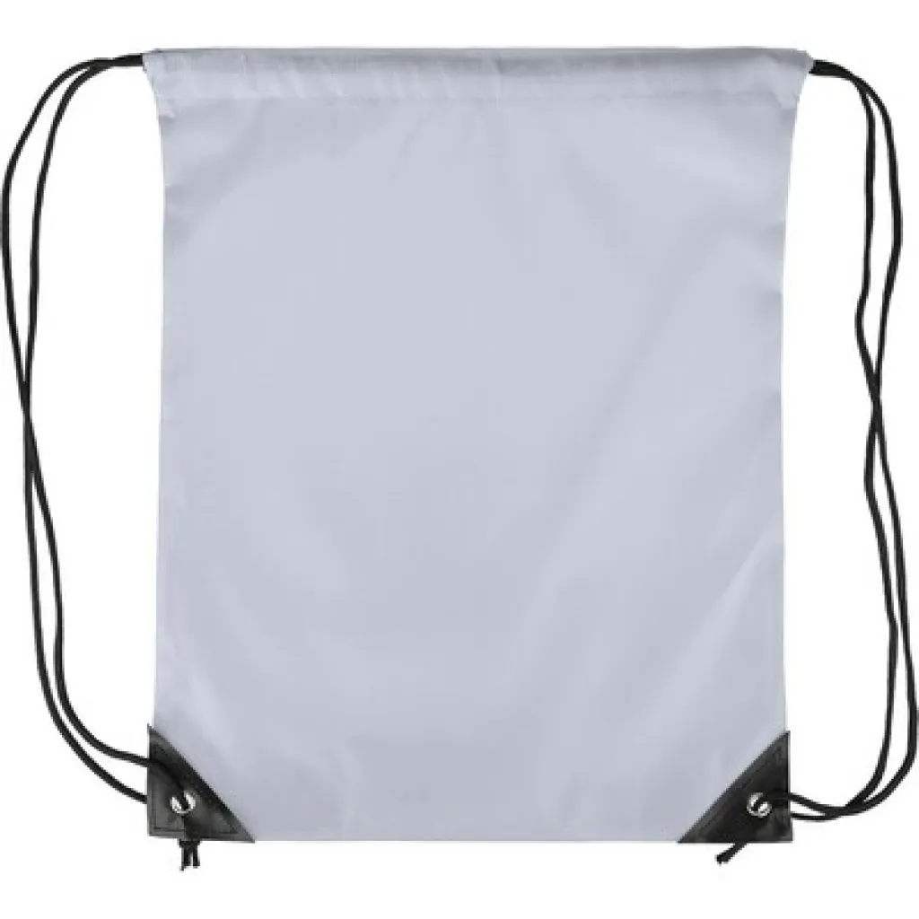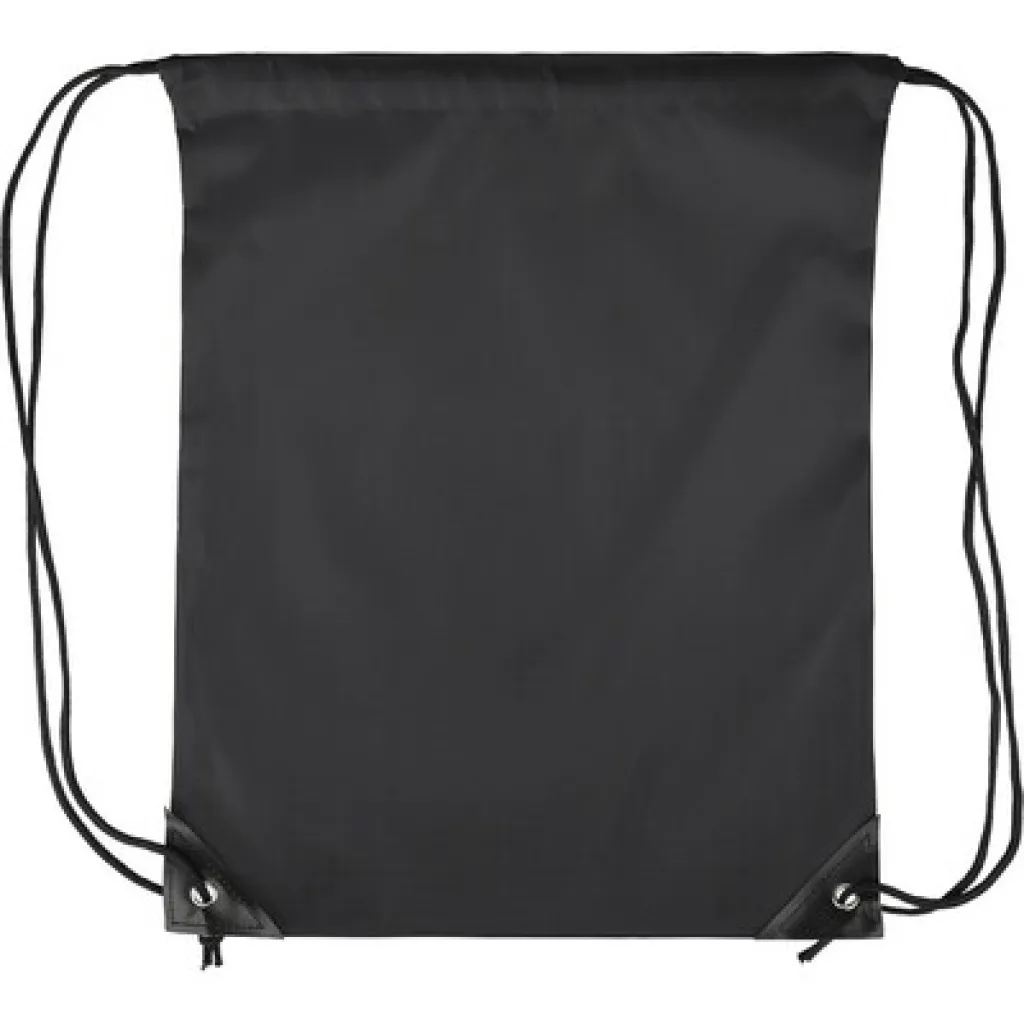 Drawstring bag, black nylon cord on each side, a pull-cord closure, one inner compartment, capacity: 5L, carrying capacity: 7 kg, product made from polyester 210D with two black PU corners on the front and internal sewing
