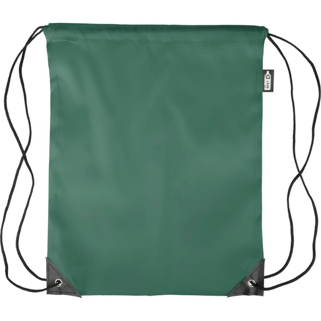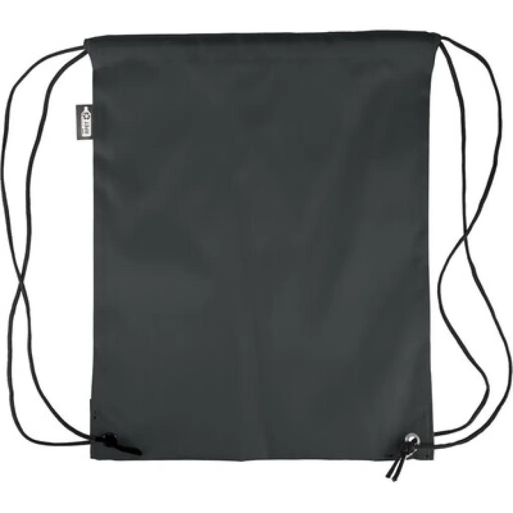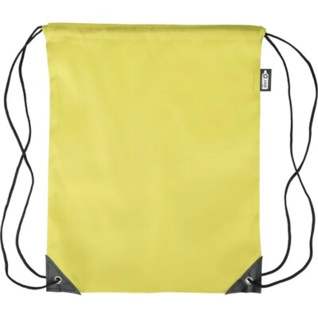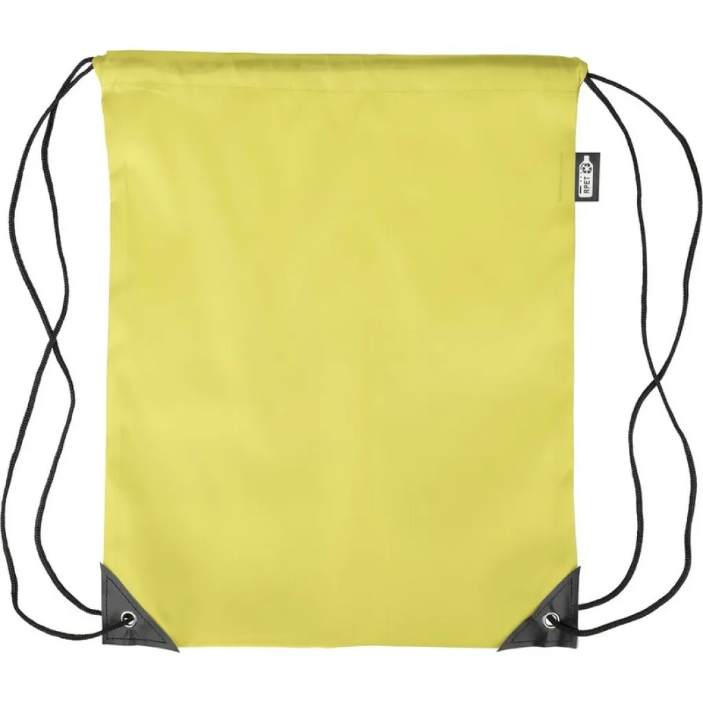 Drawstring bag, features a black nylon cord on each side, a pull-cord closure, one inner compartment, capacity: 5L, carrying capacity: 7 kg, includes RPET icon on tag, product made from RPET polyester 210D, two black PU corners on the front and internal sewing