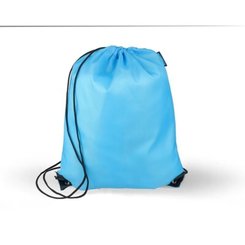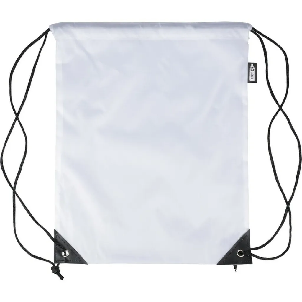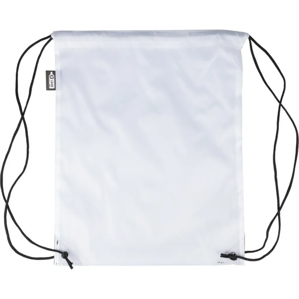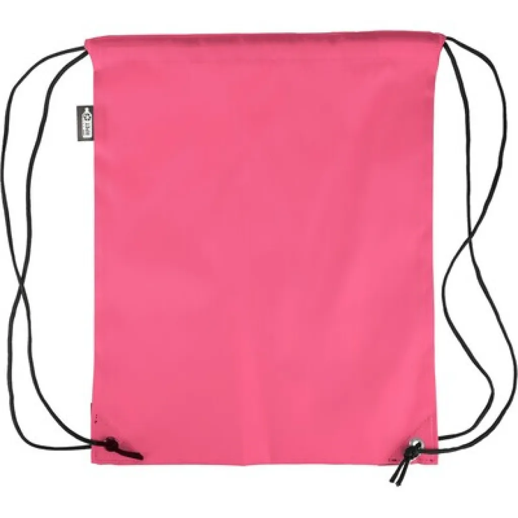 Drawstring bag, features a black nylon cord on each side, a pull-cord closure, one inner compartment, capacity: 5L, carrying capacity: 7 kg, includes RPET icon on tag, product made from RPET polyester 210D, two black PU corners on the front and internal sewing