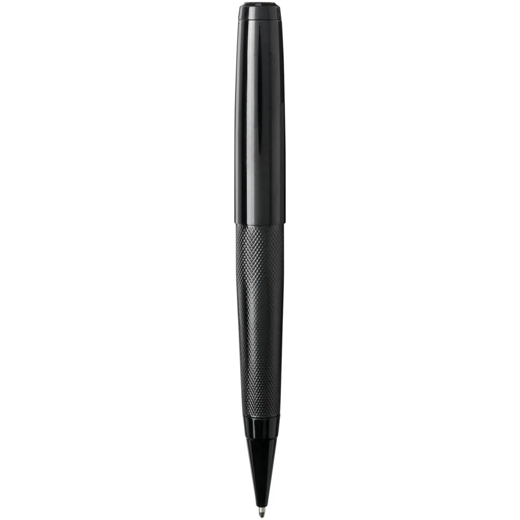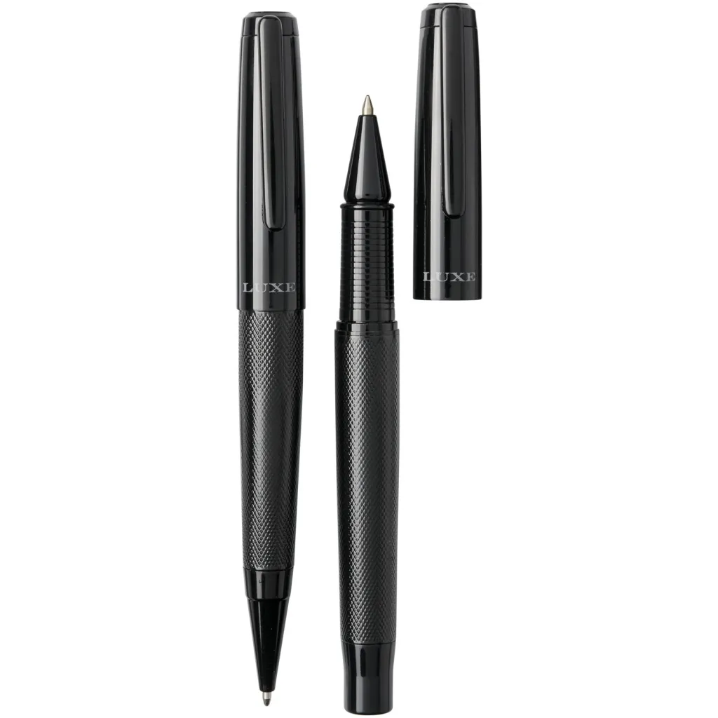 Ballpoint pen and rollerbal pen gift set with black upper and lower barrel with a glossy finish, delivered in a Luxe gift box. Ballpoint pen: 14 cm x 1.45 cm, weight: 40 gr, writing length: 800 m. Rollerbal pen: 13.8 cm x 1.45 cm, weight: 54 gr, writing length: 400 m.