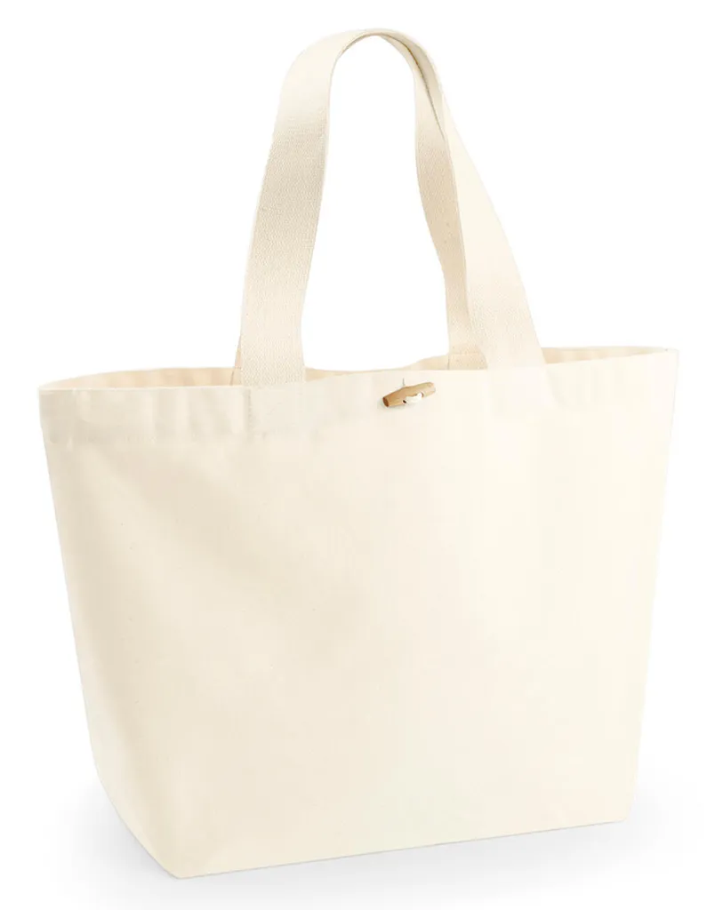 ·340 g/m² ·100% Cotton (Organic Canvas) ·Premium heavyweight fabric ·Cotton webbing carry handles (length: 60 cm) ·Natural wooden toggle closure ·Can be carried in hand or over shoulder ·Capacity: 30 Litres ·Dimensions: 40 x 39 x 19 cm ·Area for decoration: 52 x 30 cm.