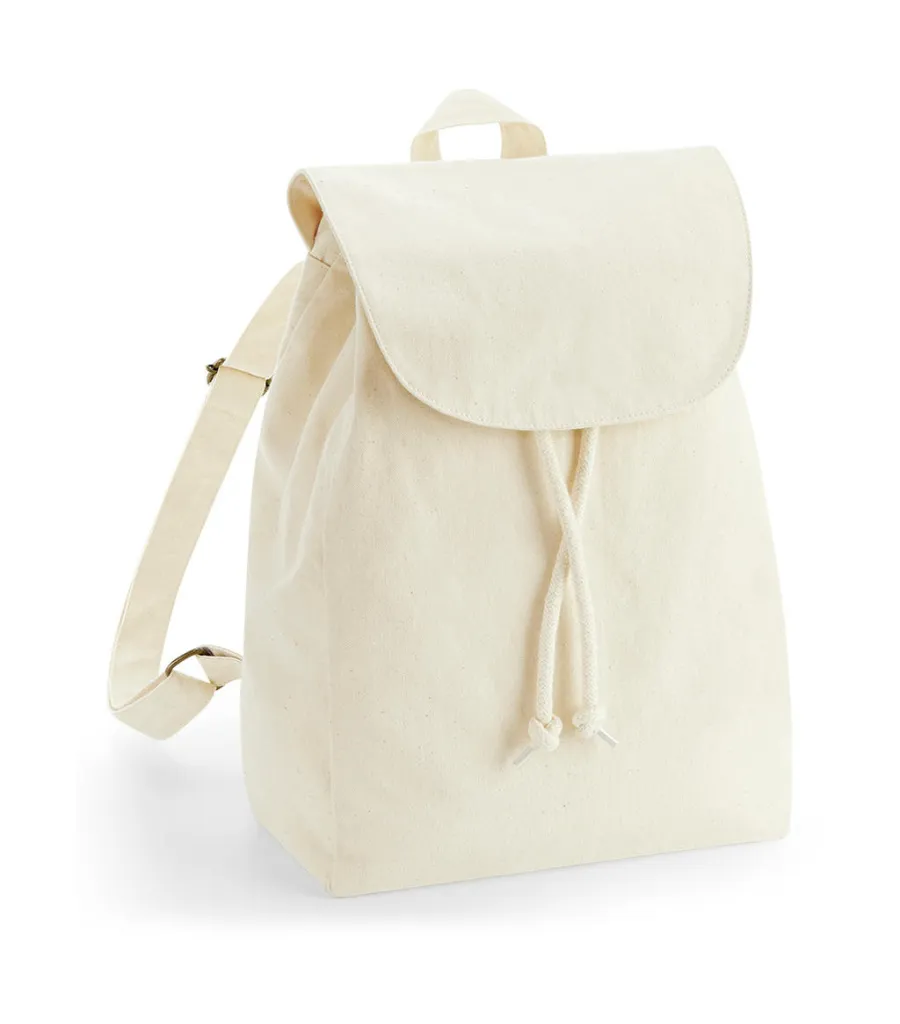 ·340 g/m² ·100% Cotton (Organic) ·Heavyweight Canvas fabric ·Fold over flap with secure press stud ·Rope drawcord closure ·Self-fabric adjustable shoulder straps ·Grab handle ·Capacity: 10 litres ·Dimensions: 26 x 38 x 14 cm