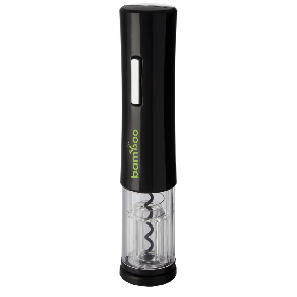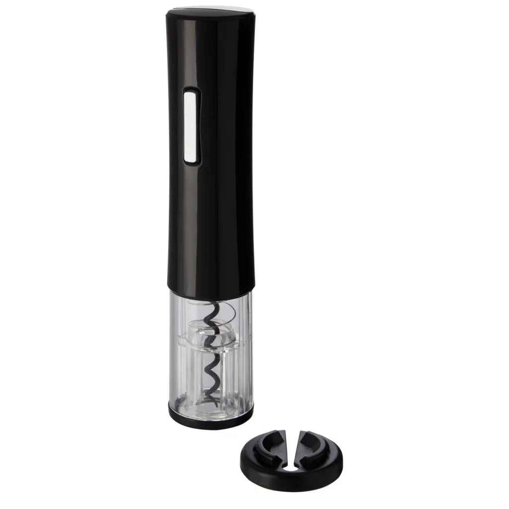Electric wine opener that features a foil cutter. It works with 4 AA batteries (not included).