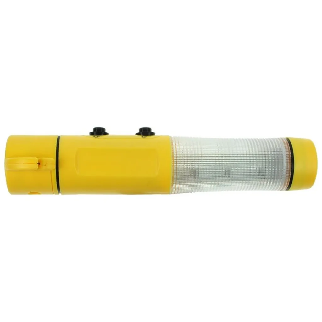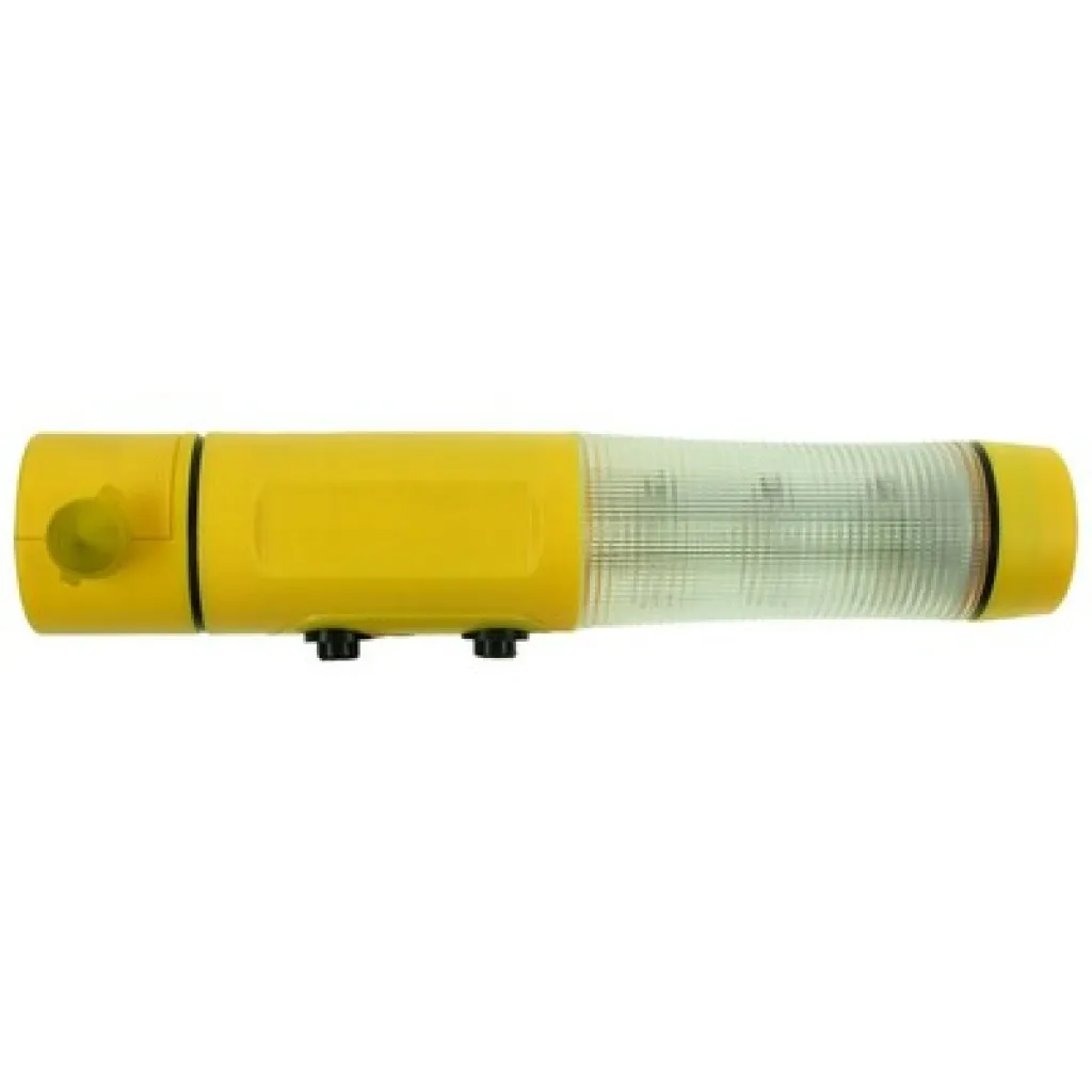 Emergency torch with magnet, 1 white LED and 12 red flash lights at side, seat belt cutter and safety hammer