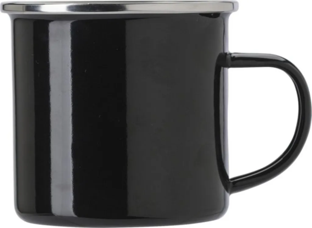 Enamel drinking mug (350 ml) with stainless steel edge. Individually packaged in a brown cardboard box. This product is not dishwasher safe.