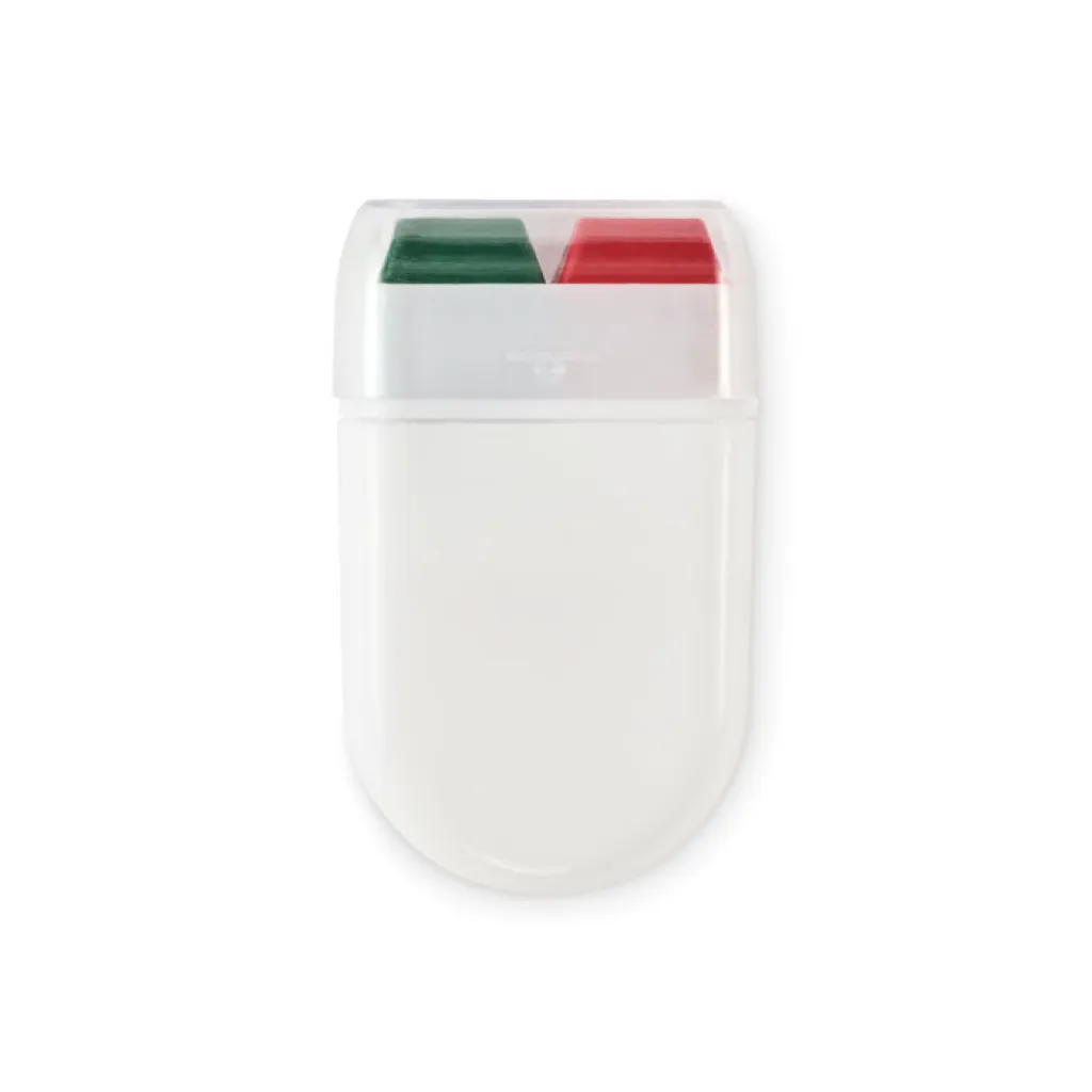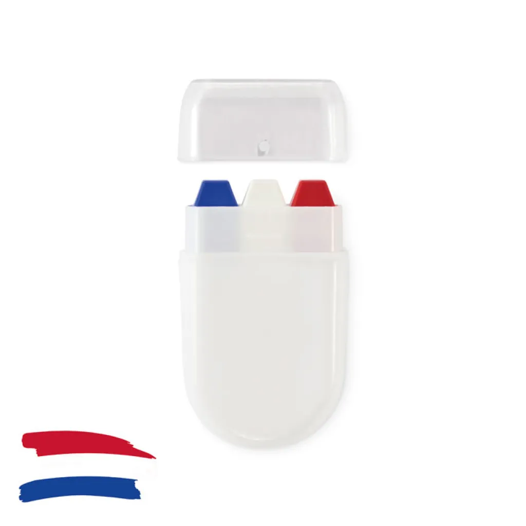 Body paint stick in national flag colours with wax paint in PP case and PS lid.