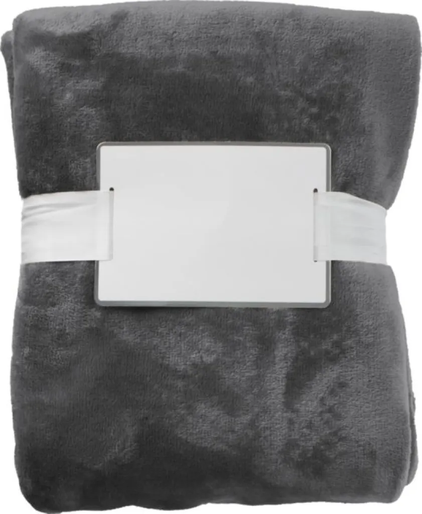 Flannel fleece (280 gr/m²) blanket with white ribbon and cardboard. Size: 120 x 150 cm.