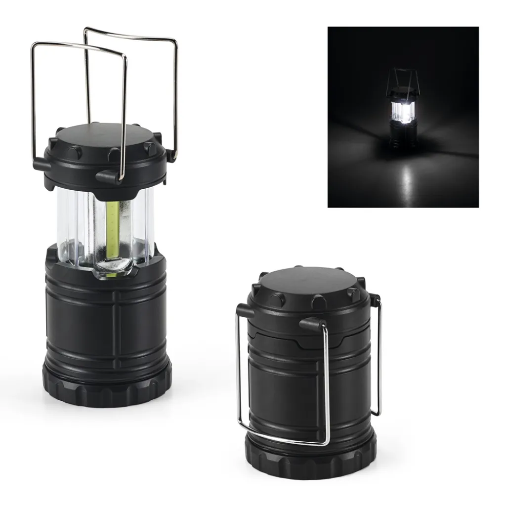 ABS camping lantern with 3 LED COB. This flashlight has metal handles and 3 AAA batteries included. Product supplied in a white cardboard box. ø69 x 185 mm