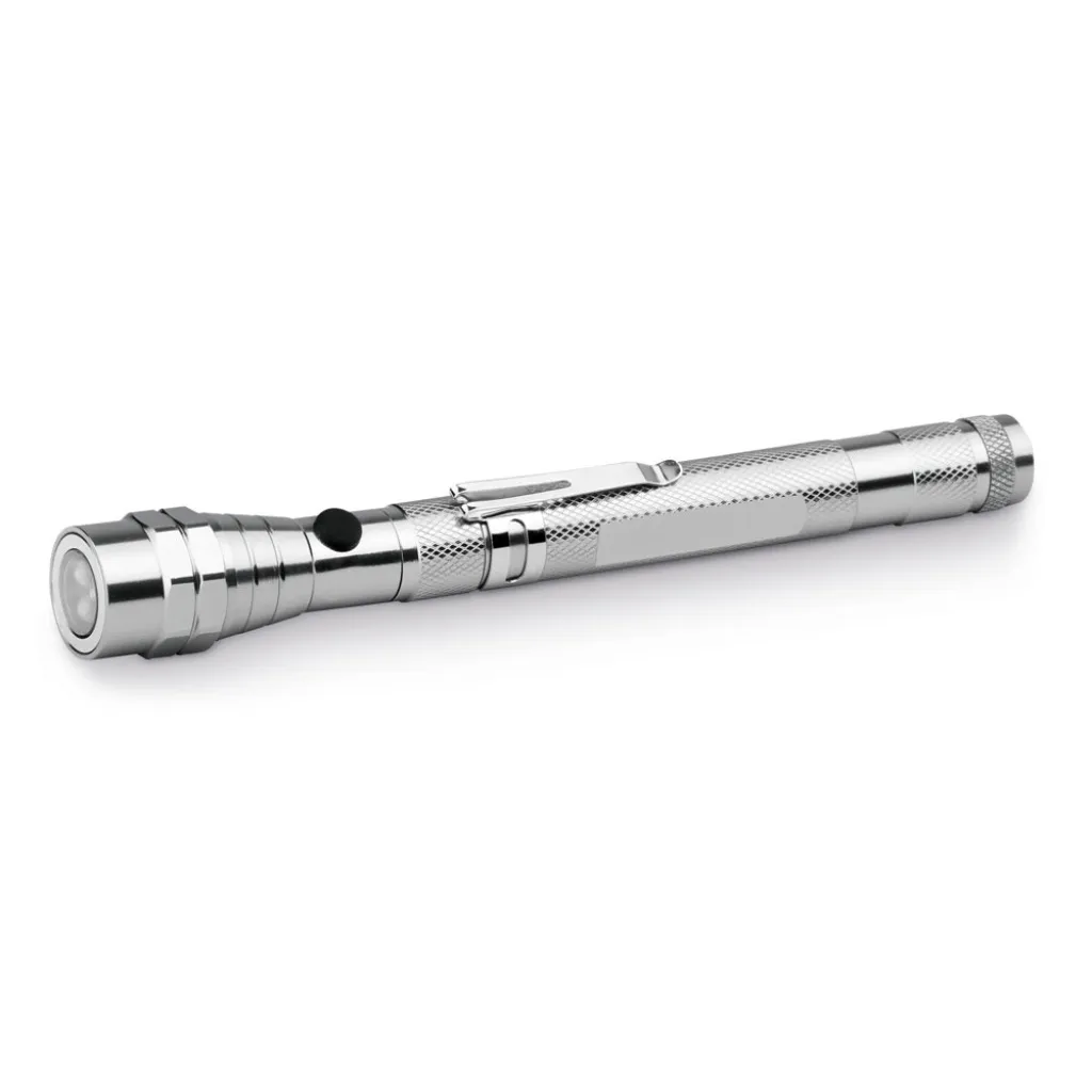 Metal extendable LED flashlight with 3 LEDs, magnet and clip. Includes 4 LR44 lithium batteries. ø22 x 175 mm