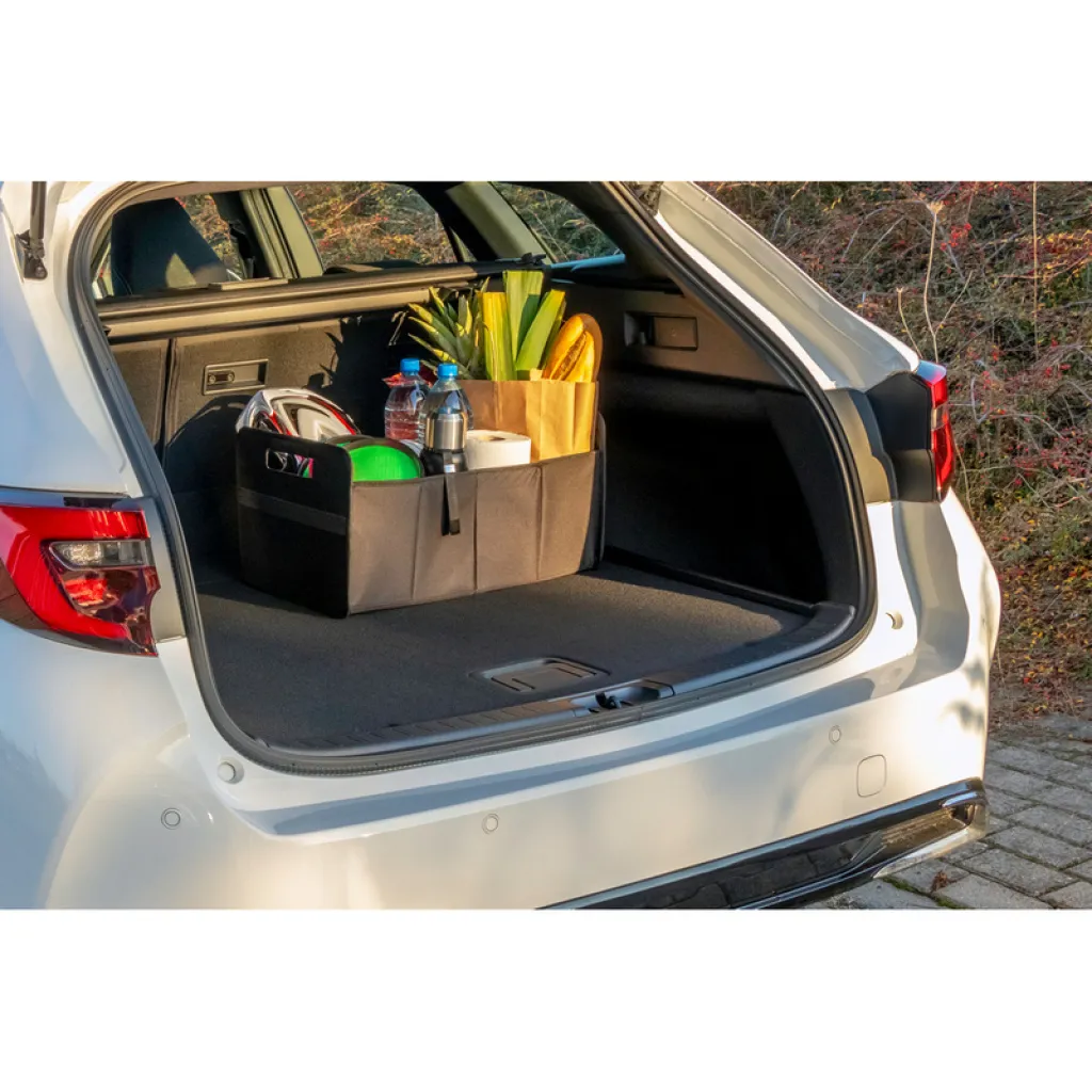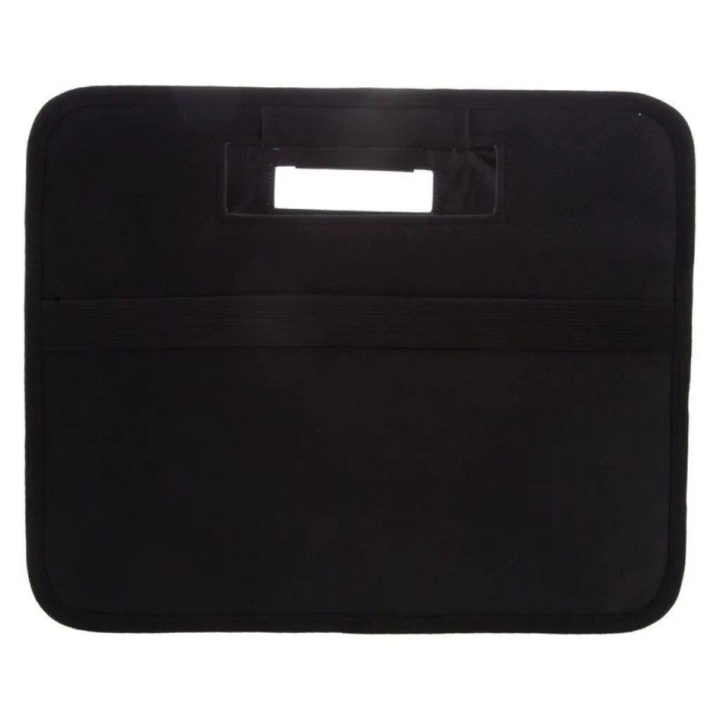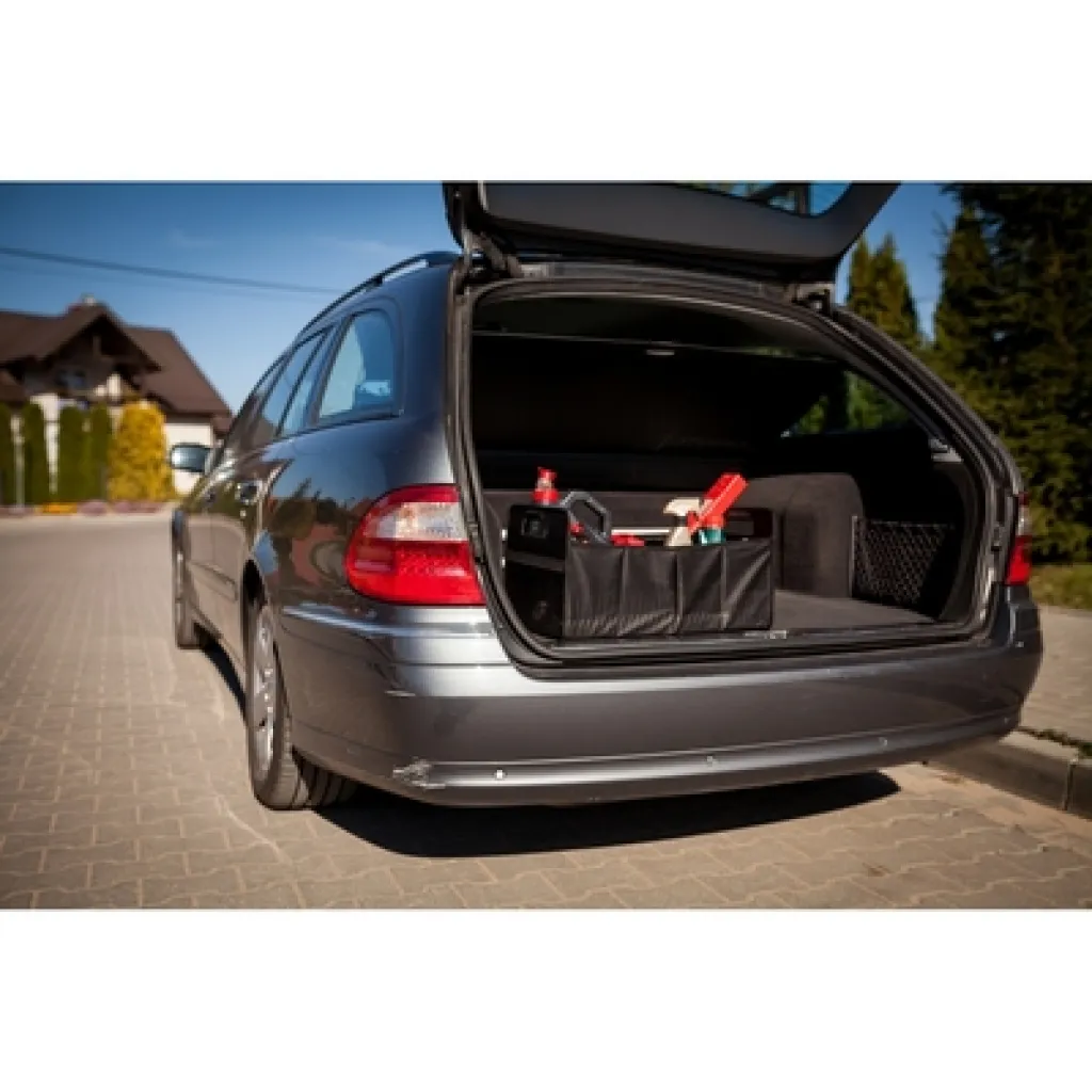 Foldable car organizer with 2 compartments, additional layer to support bottom and 2 side mesh pockets inside