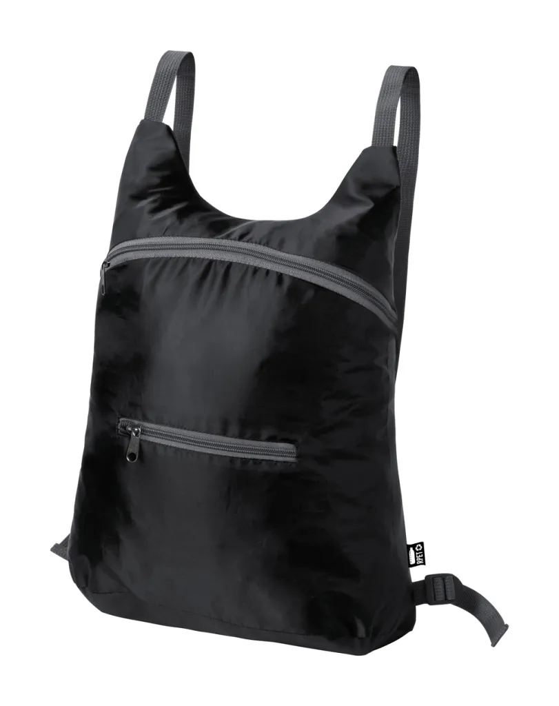 Foldable RPET backpack with zipped pockets and adjustable shoulder straps, 210D RPET polyester. With distinctive RPET label.