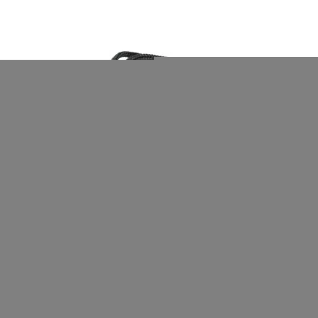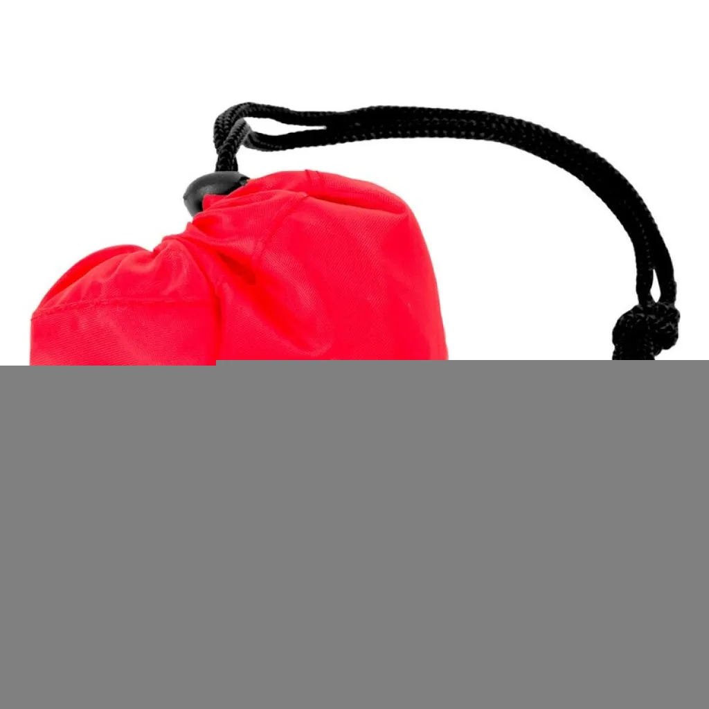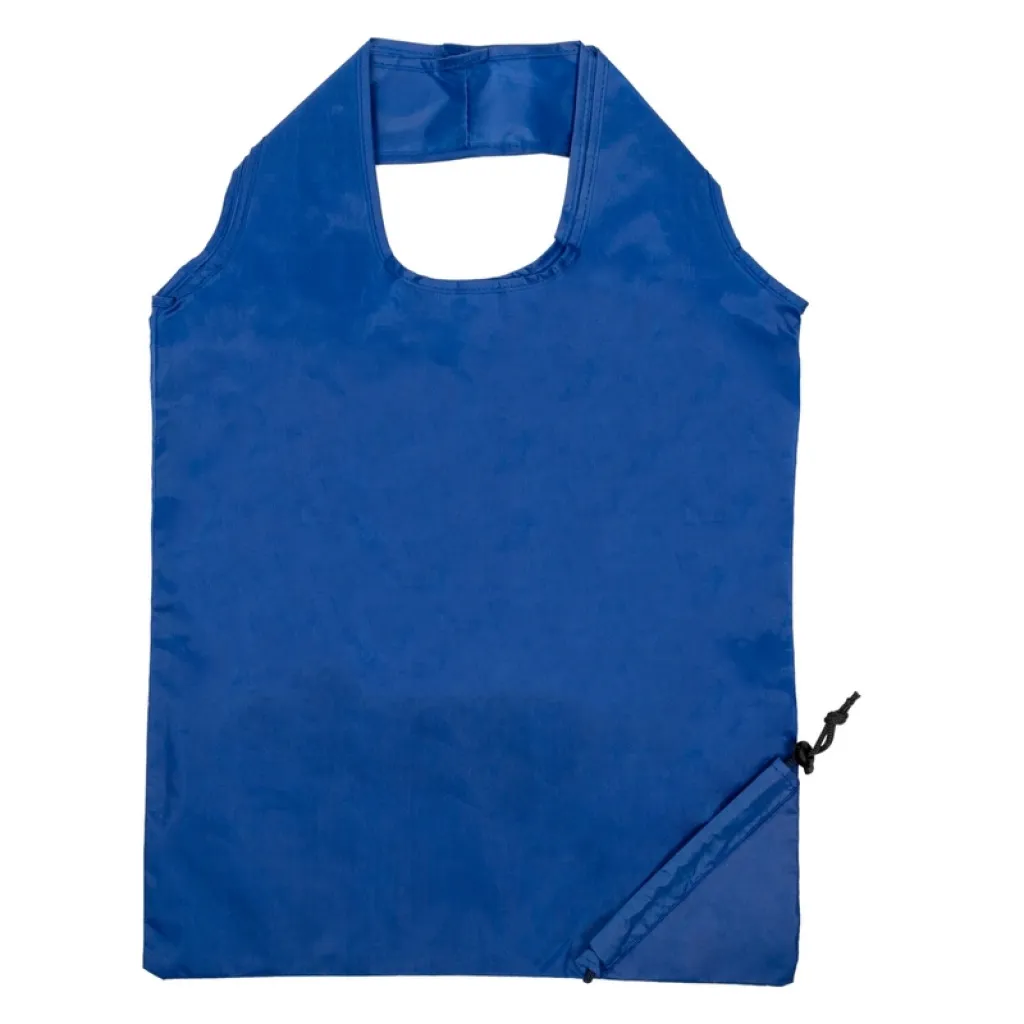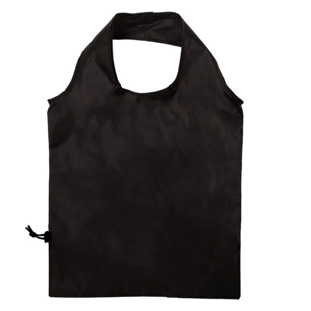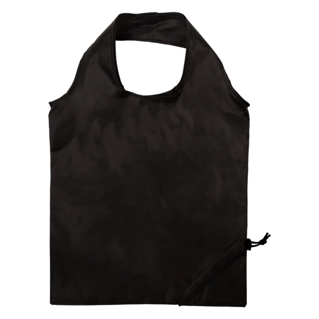 Foldable shopping bag, folded into corner with string and plastic stopper