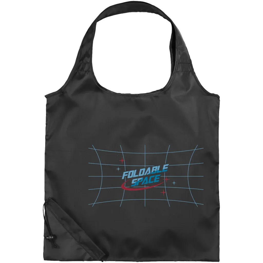 Bungalow foldable tote bag. Open main compartment with double handles. Unique fold-away function gathers into corner with drawstring closure. 210D Polyester.
