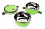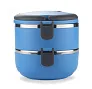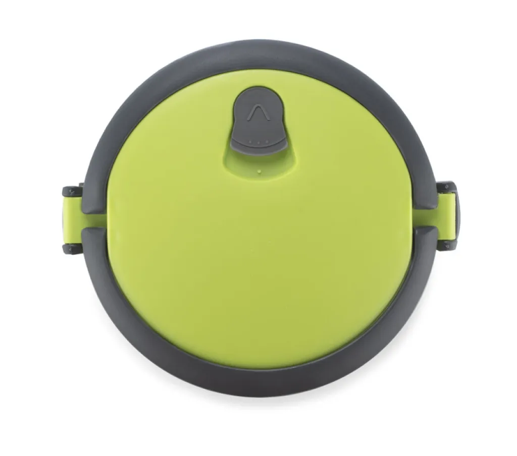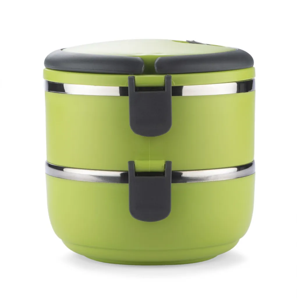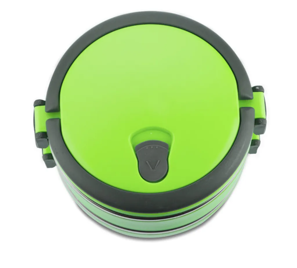 The container with the inside made of stainless steel is divided into two parts which are stackable which ensures handy and comfortable transfer of two-course meals. The upper chamber is equipped with a seal. Handles made of plastic are foldable. Total capacity: 1,400ml.