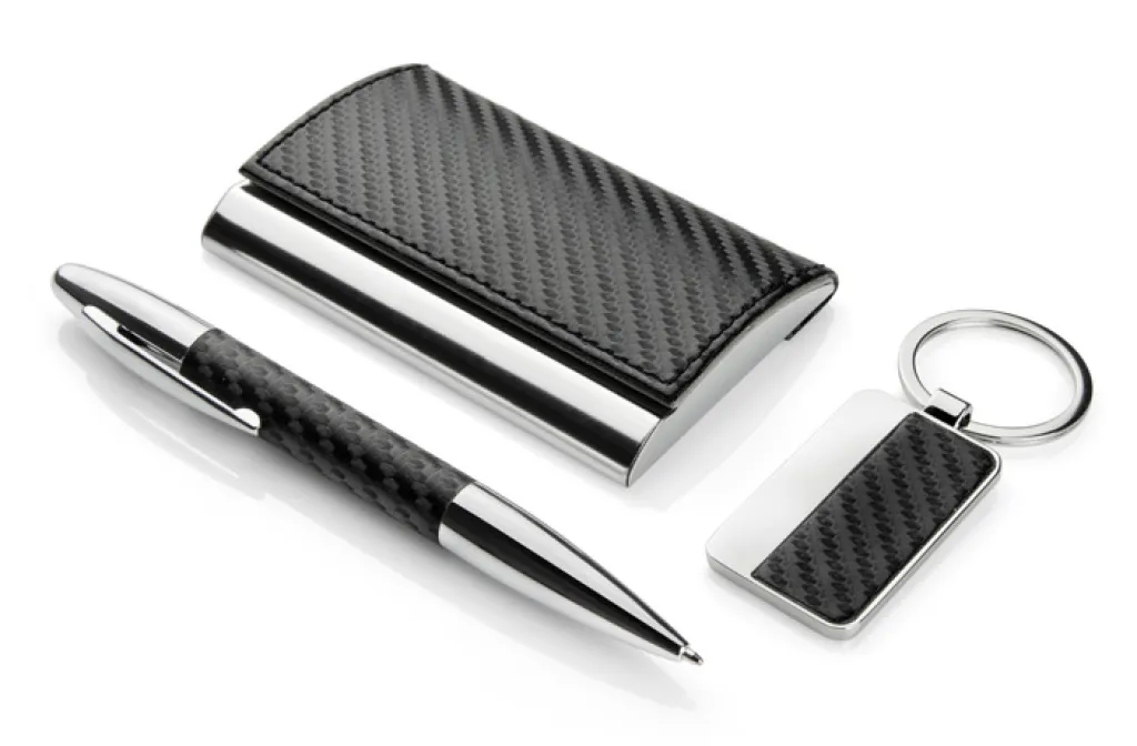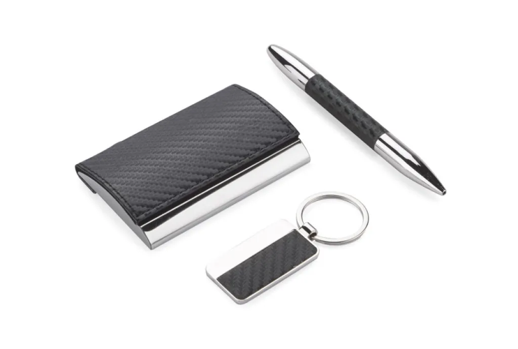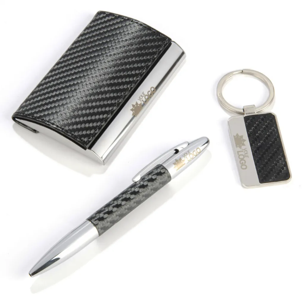 Elegant gift set which includes business card holder, key chain and a ball pen. All packed in a black box. Logo can be engraved on the keychain or business card holder.