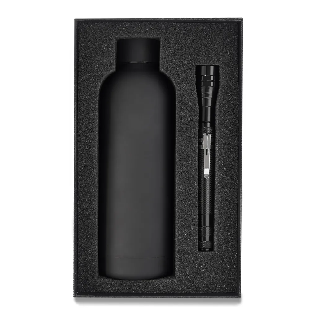Gift set consisting of a vacuum bottle and a flashlight. Bottle with a capacity of 500 ml. The inner wall is made of high-quality 18/8 steel, the outer wall is made of 18/0 steel with a pleasant-to-touch finish. Maintains temperature above 40°C for up to 15 hours. Metal retractable flashlight. Telescope with a length of 38.5 cm, with 3 white LEDs, 10 lumens. Equipped with a clip and magnets at both ends. Powered by 4 x AG13 batteries (included). All in an elegant gift box.