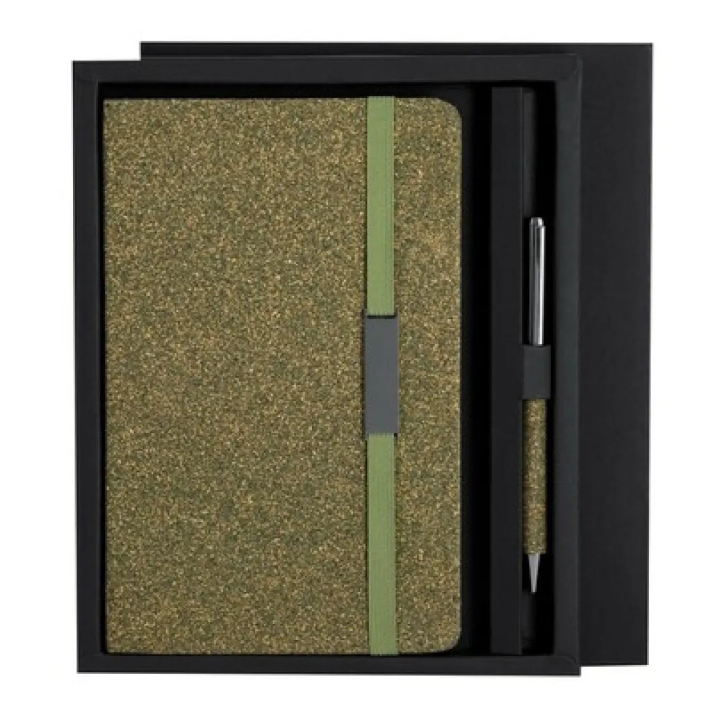 Gift set, features notebook approx. A5 size with 80 lined sheets with an extra elastic band closure, ball pen writes in blue, hard cover of the notebook and ball pen barrel are made from repurposed tea fibre, black gift box included