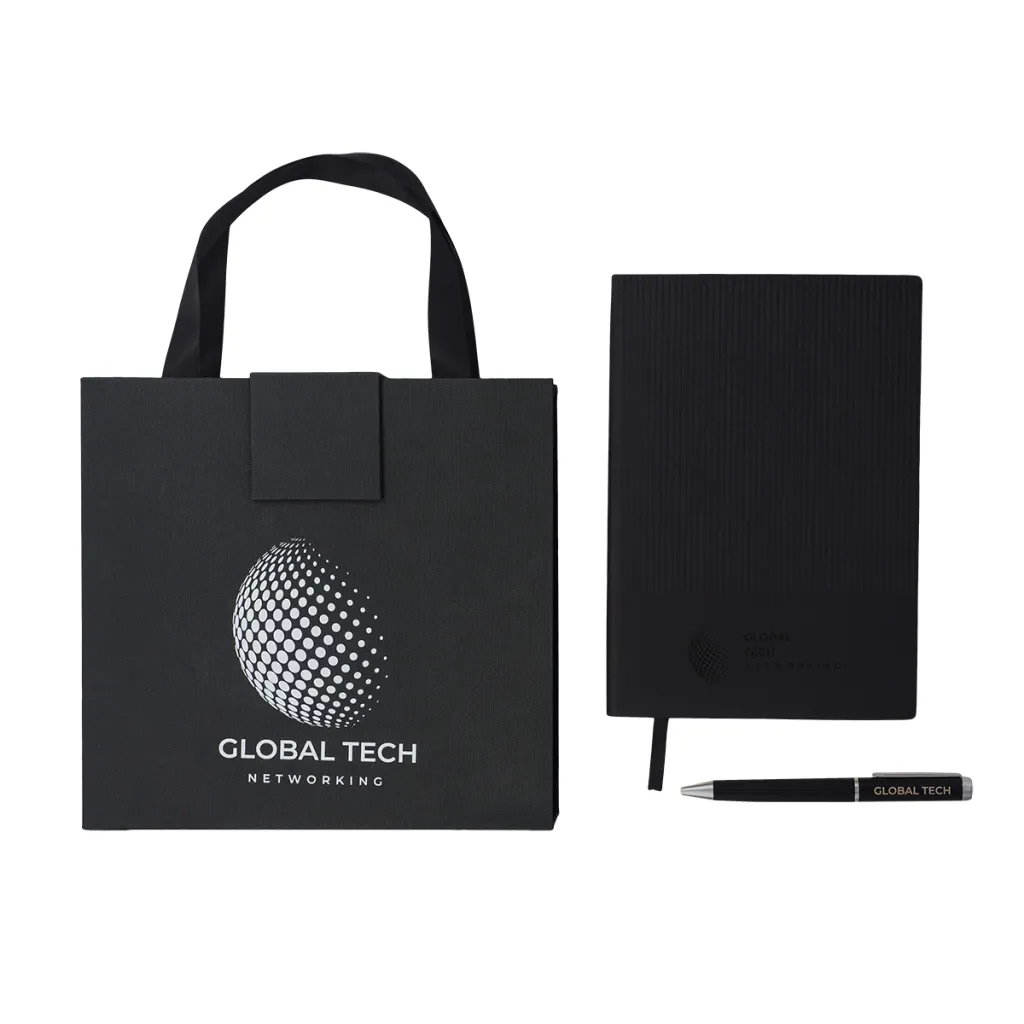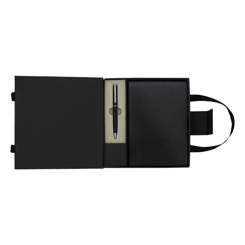 A set consisting of an A5 notebook (80 sheets in line, 80 g/m2) and a pen with a blue refill. The set is packed in an elegant box with handles.