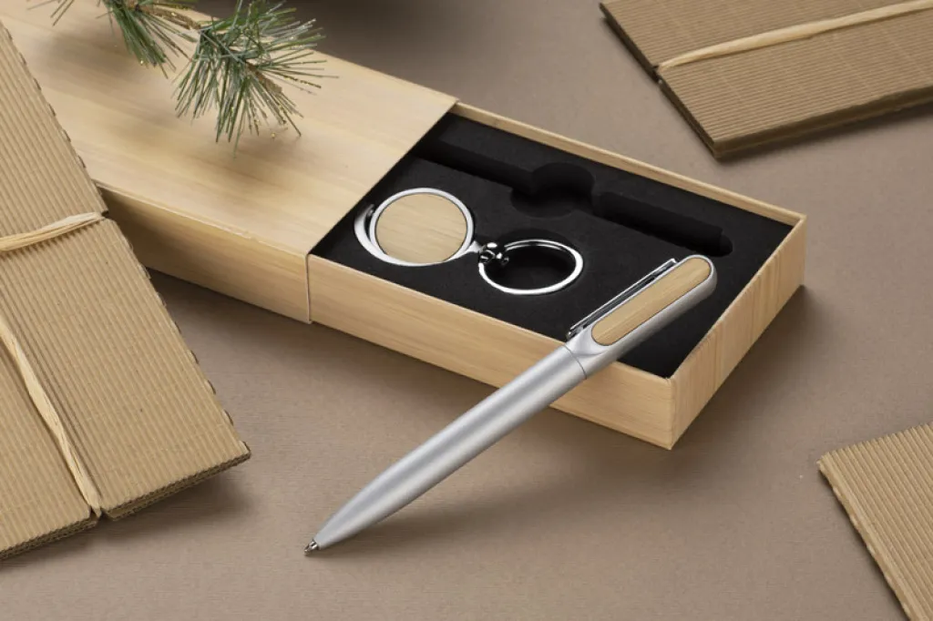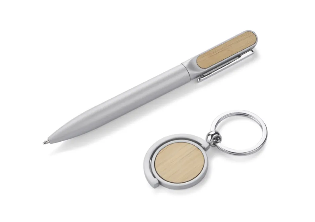 The elegant SELO gift set consists of a pen and a key ring. Both pritems have bamboo elements, which gives them an interesting look. The SELO set is the perfect gift idea. Packed in a box made of material imitating bamboo.