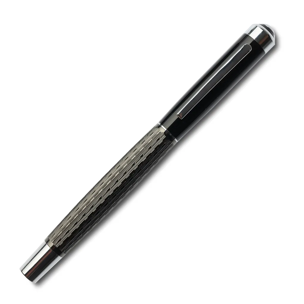 An elegant writing set consisting of a metal fountain pen, ballpen and a bottle of blue ink. Packed in a gift box.