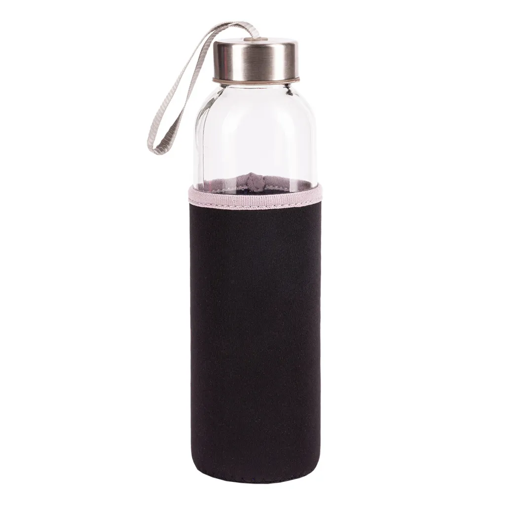 Leak proof, tempered glass bottle with neoprene sleeve cover and wrist loop. 500 ml