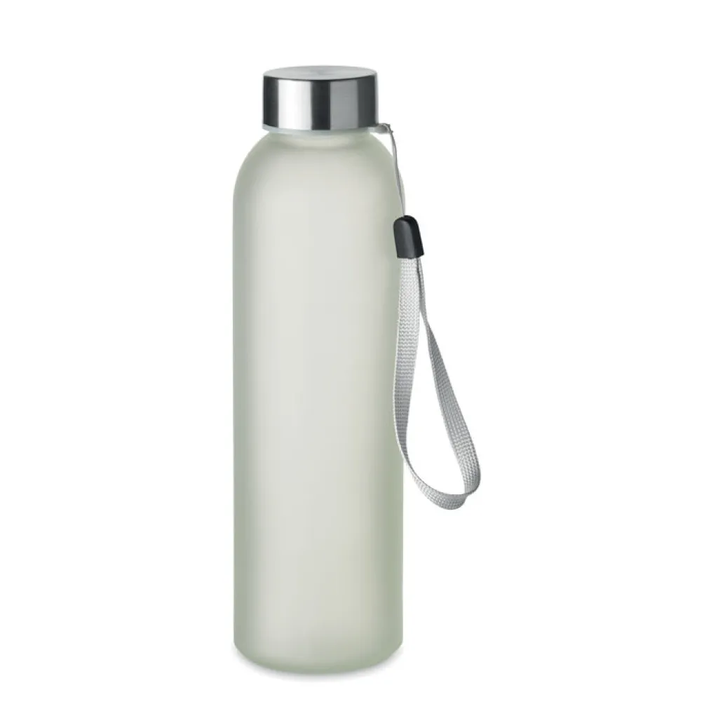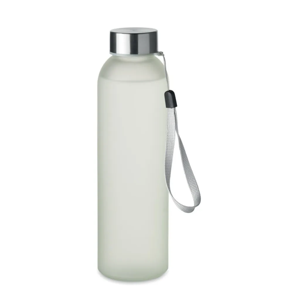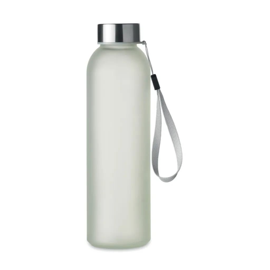 Glass bottle. It has a stainless steel lid and hanging strap. Capacity: 500 ml.