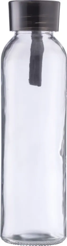 Glass drinking bottle (500 ml) with PS lid and silicone strap. Individually packaged in a brown cardboard box.