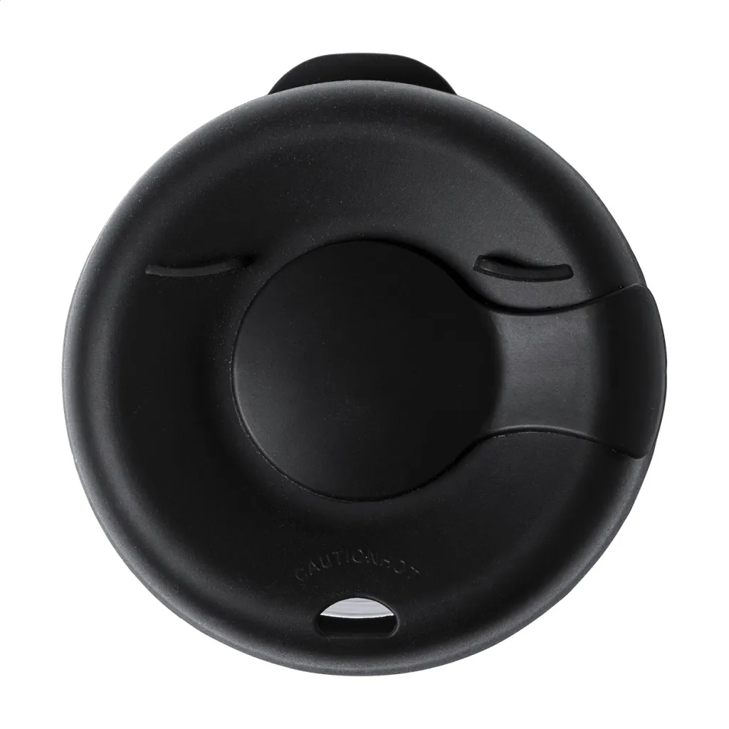 Single wall borosilicate glass travel mug with natural cork grip and plastic drinking lid, 300 ml.