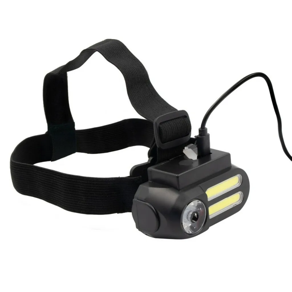 Head torch with LED and COB light, both types of light can be turned on simultaneously, 1x LED (max. 50 m, approx. 80 Lumen), 2x COB (max. 10 m, approx. 100 Lumen), ON/OFF button, micro USB input, 5V/500 mA input, 4 flashing functions, working time: cca. 2,5h, light direction adjustment, waterproof (IPX5), USB rechargeable, micro USB cable included