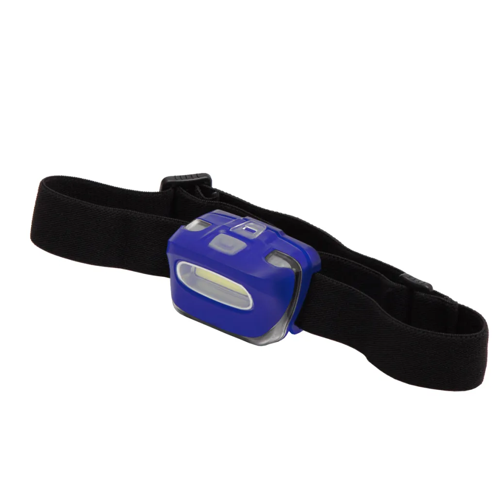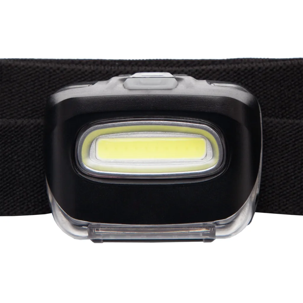 Headlamp with COB diodes (100 lm, range 80 m, lifetime 100 000 h) and removable head strap. Range 18 - 20 °. 3 AAA batteries are included.