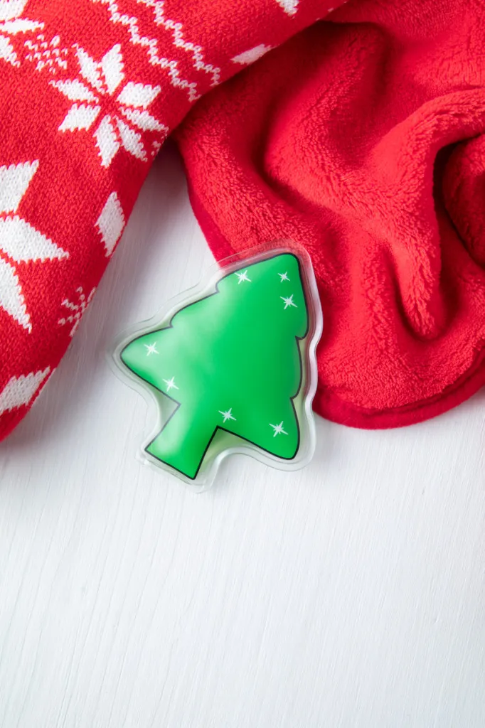 Christmas tree shaped reusable heat pack.