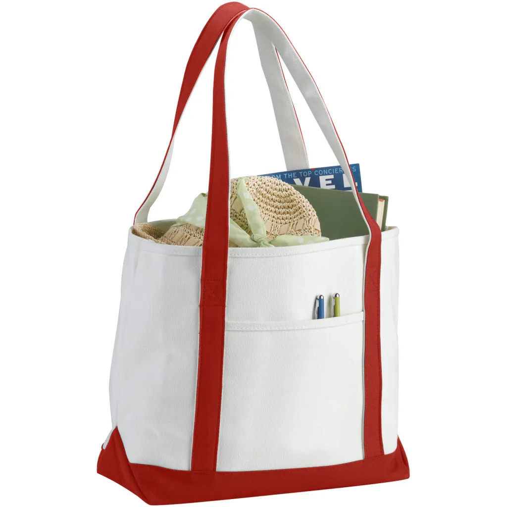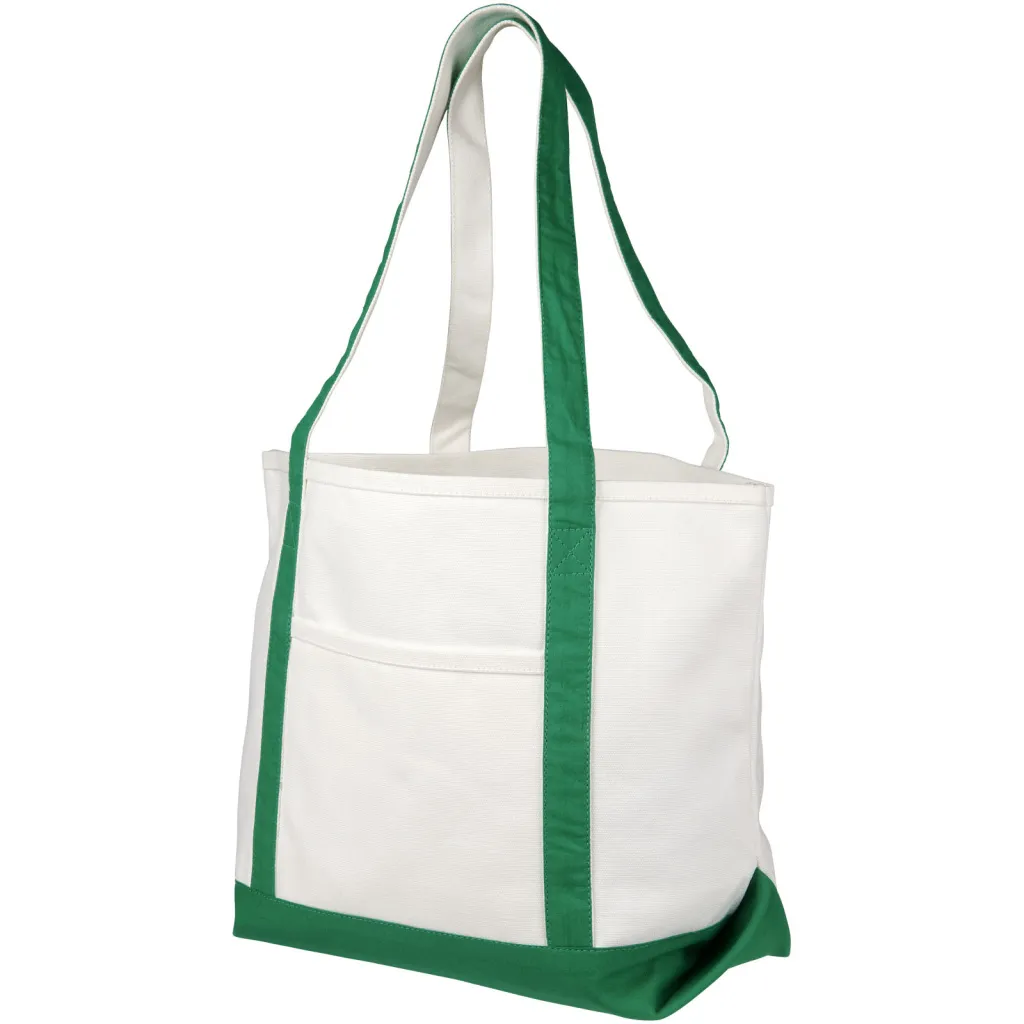 Great for outdoor events and travel. Classic boat tote shape in heavy weight and sturdy material. Open main compartment. Open front pocket. Drop down height of handles is 30 cm.