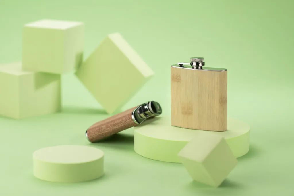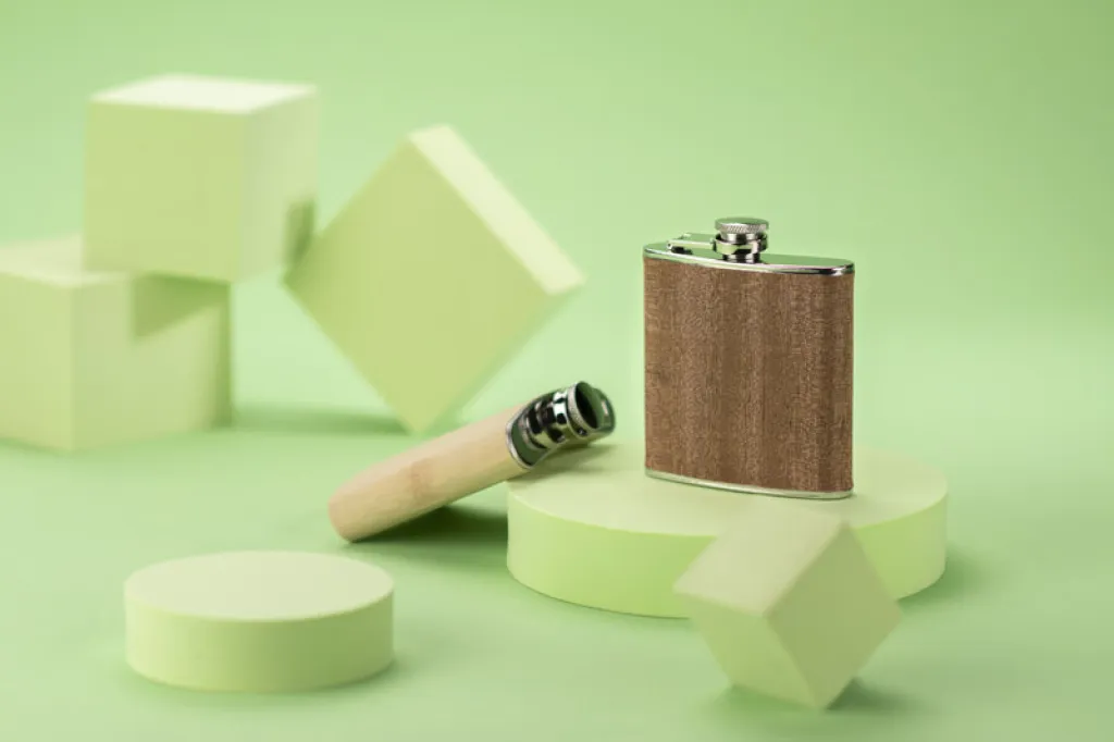 200 ml stainless steel flask with a secure closure. It is finished with a very thin layer of natural wood.