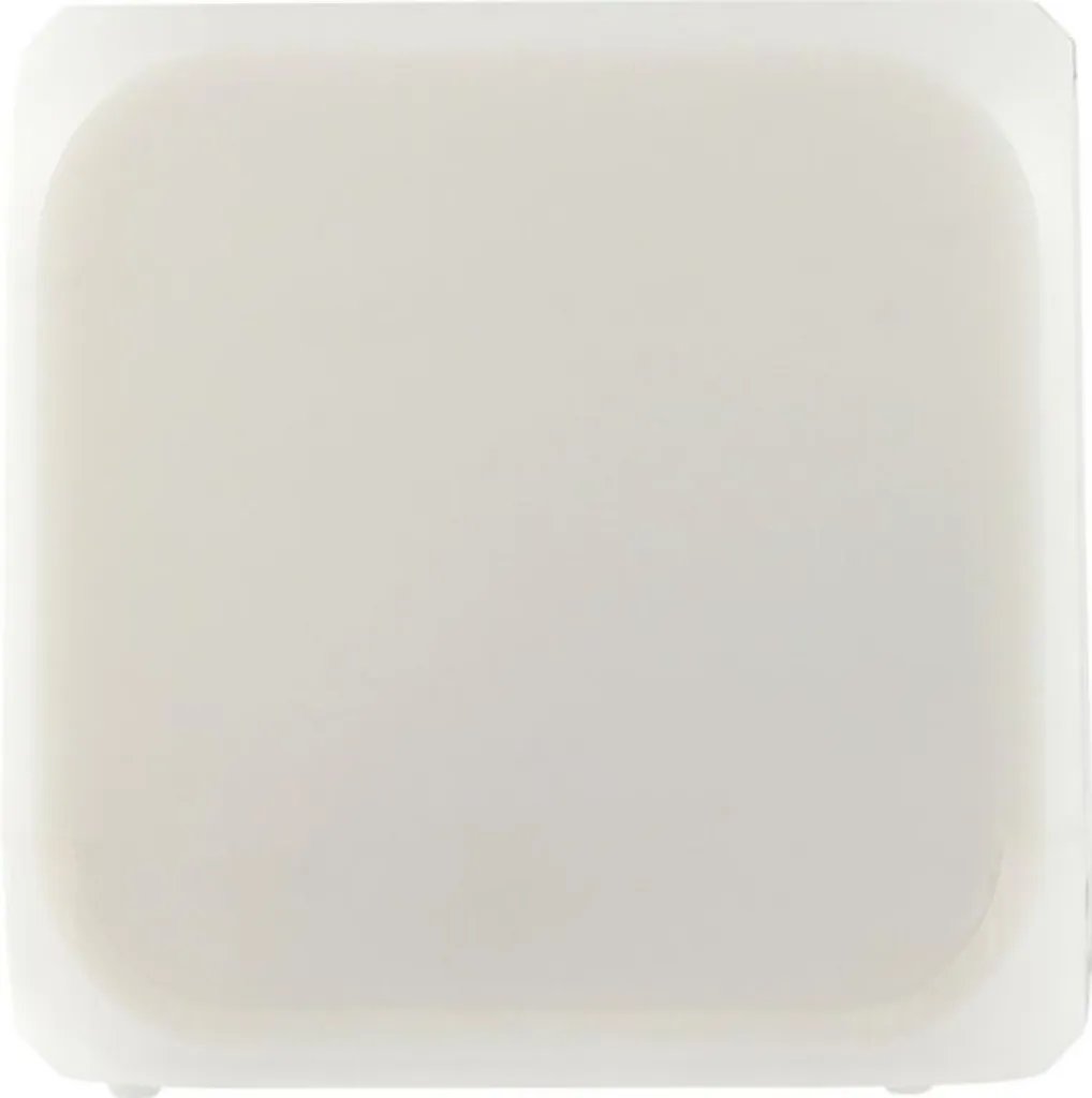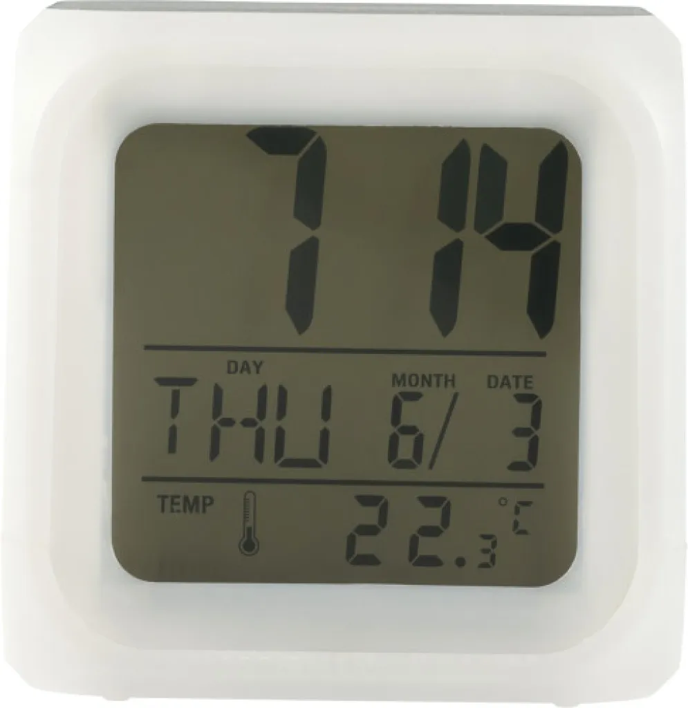 HIPS cube-shaped alarm clock that changes in color. Displays time, day of the week, date and the temperature. Batteries included.