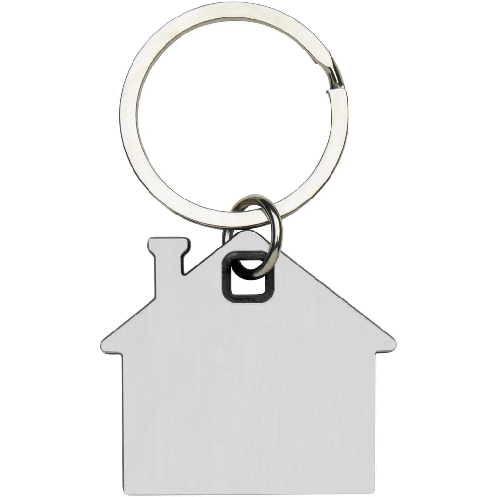 House-shaped keychain with a stainless steel plate with a frosted design front and back, and a coloured plastic chip in the middle.