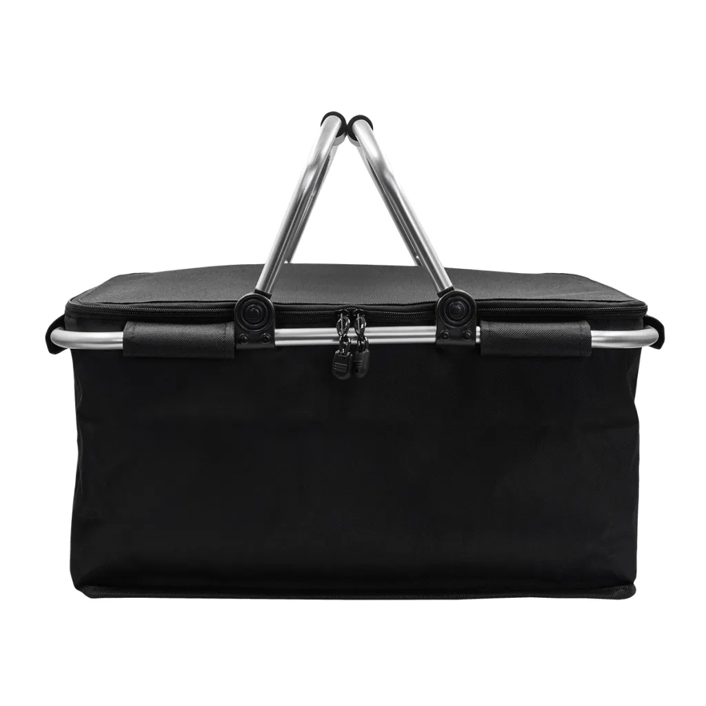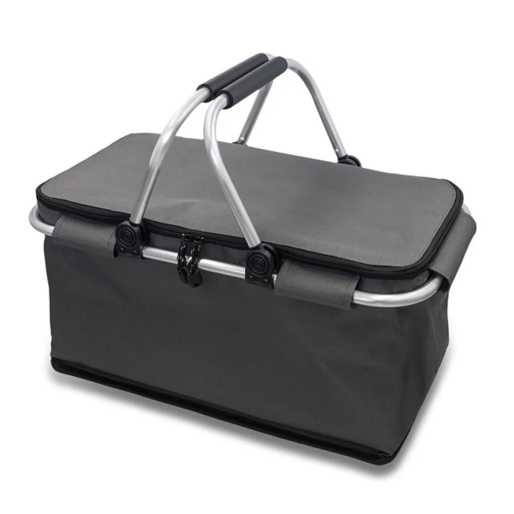 Polyester insulated picnic basket with aluminium frame and EVA handle. It offers excellent thermal insulation thanks to aluminium foil and EPE foam bedding inside the basket.