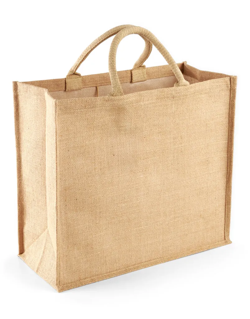 ·100% Jute, laminated ·Cotton webbing carry handles ·Capacity: 29 Litres ·Dimensions: 45 x 39 x 21 cm.