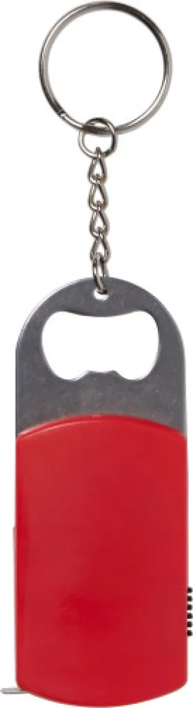 ABS key holder with bottle opener, one white LED, and tape measure (1 meter). Batteries included.
