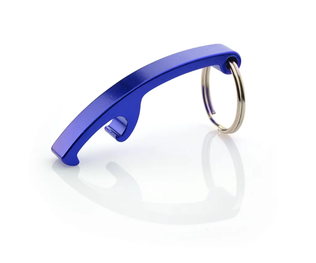 Aluminium keychain with a bottle opener function. There are 5 colour versions available. It's individually packed into a polybag.