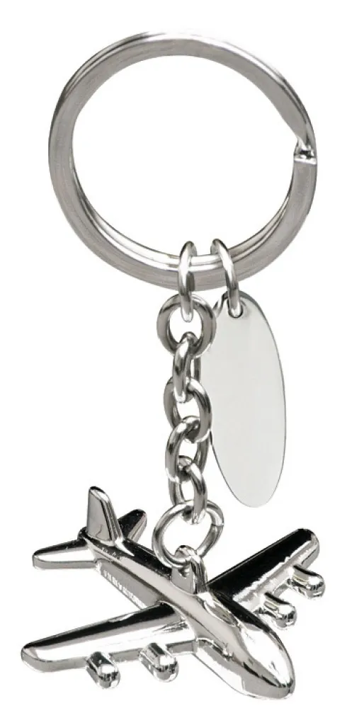 Keychain – mini aeroplane with a unique 3-d shape. It's made of chrome-plated metal, packed individually into a black cardboard box. Logo might be engraved on a metal plate which is hung together with a plane on the circle.