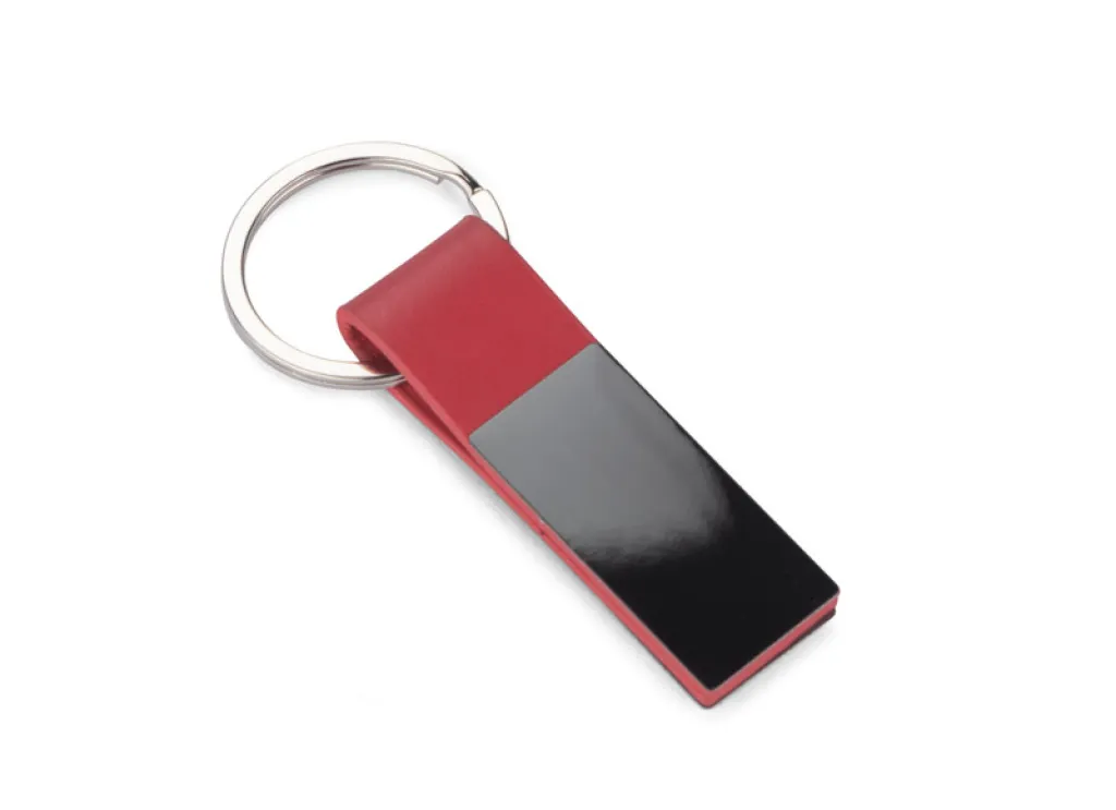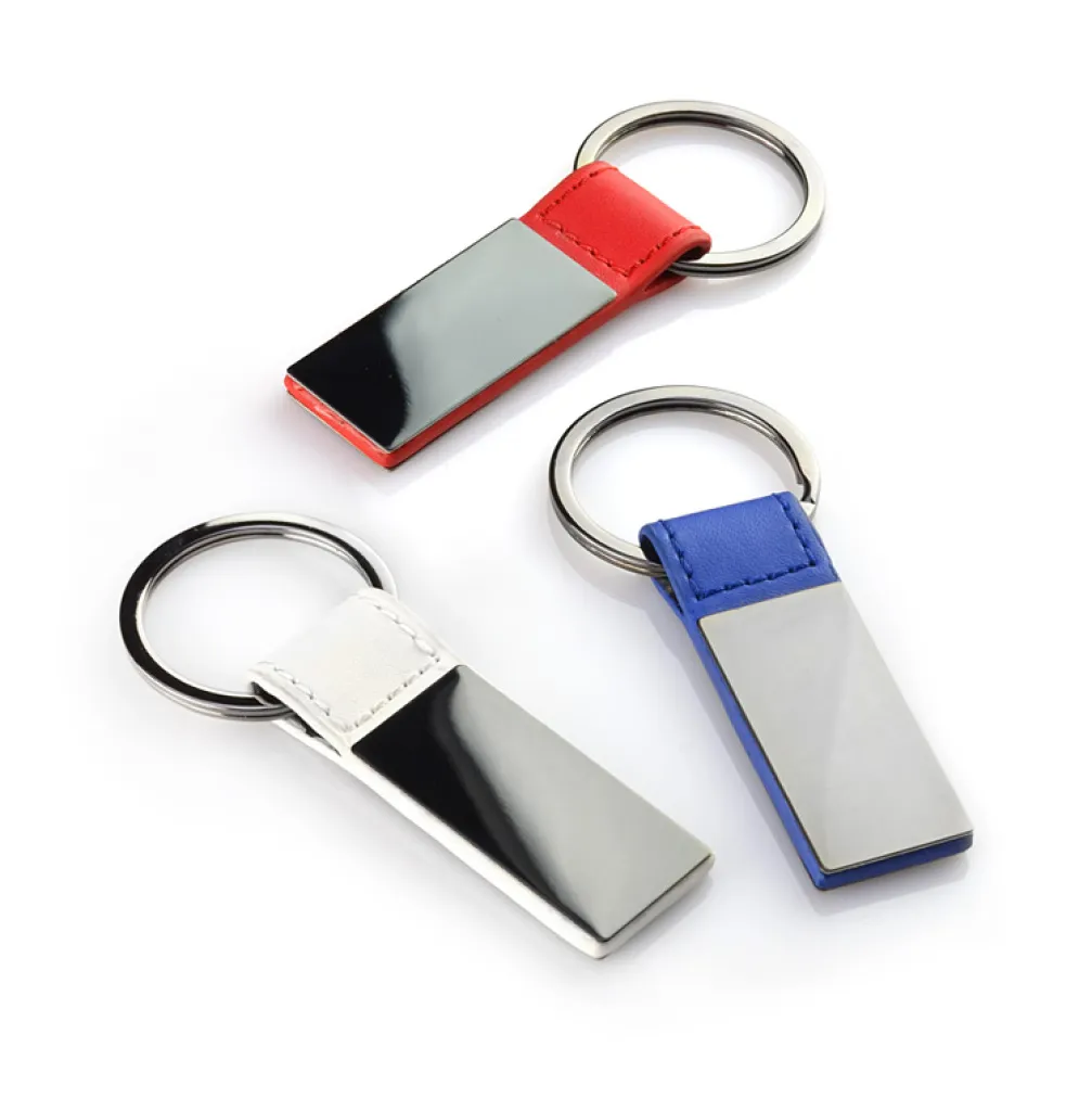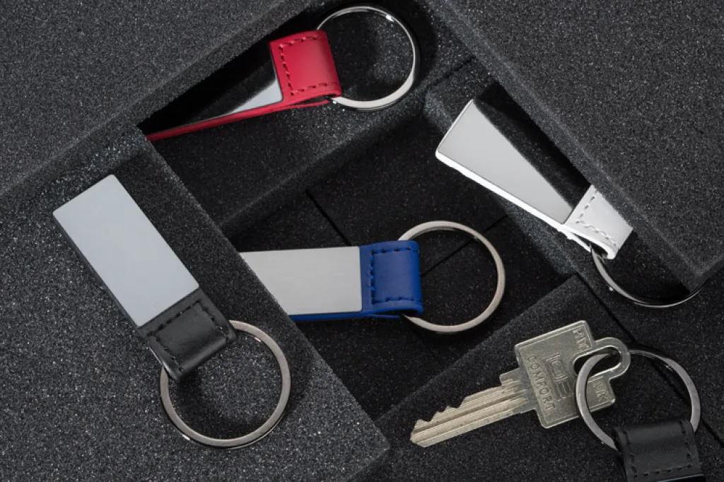 Elegant keychain made from eco leather and metal. Logo can be engraved on both sides.