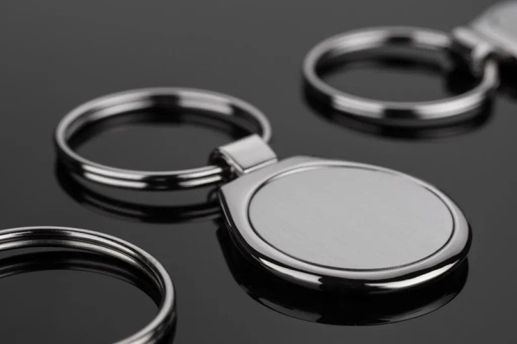Classic key chain made of chromed metal. Logo may be engraved on metal badge.