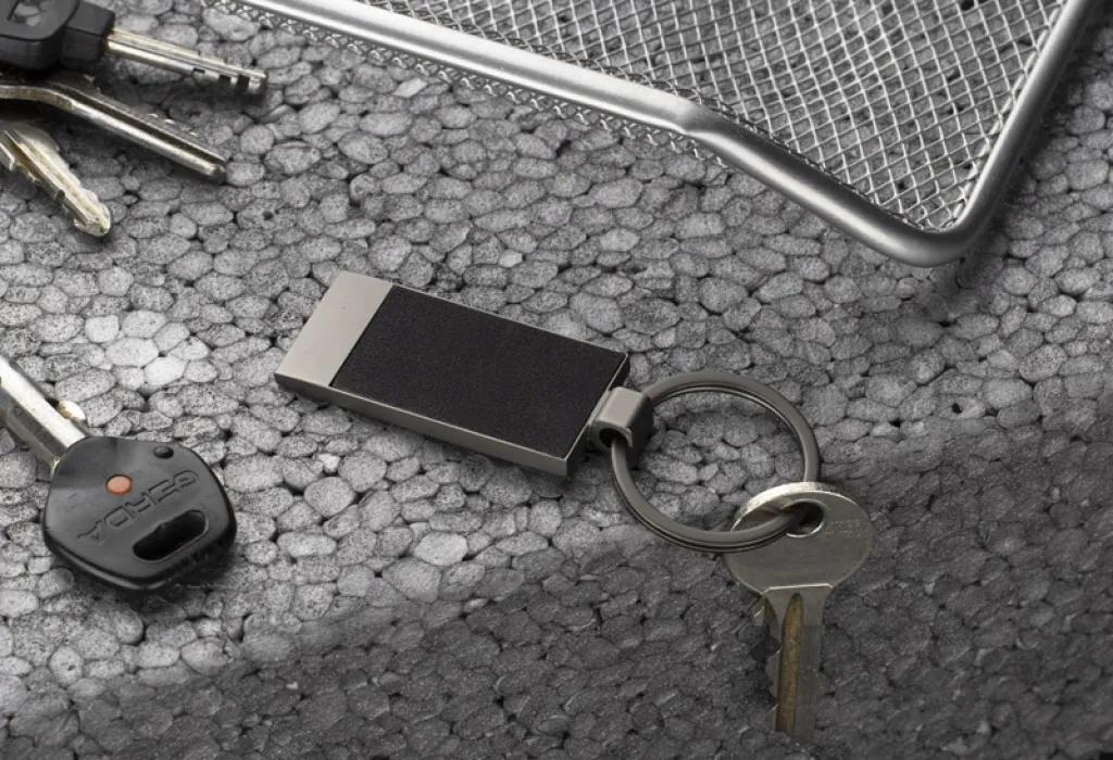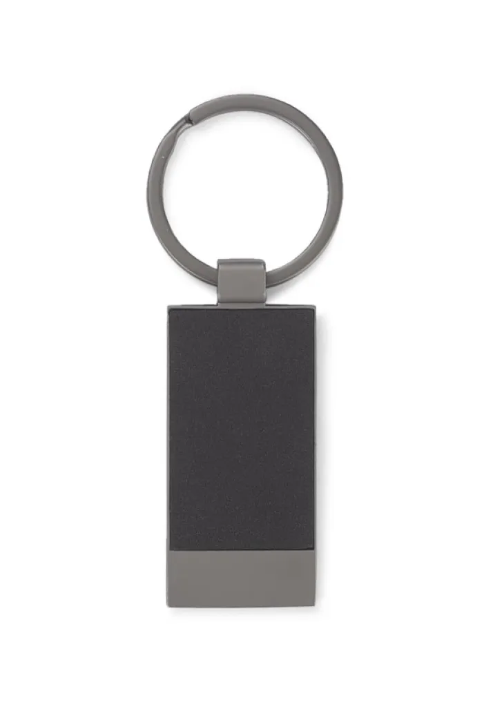 Metal keychain with pleasant-to-touch material. Packed in an cardboard. box