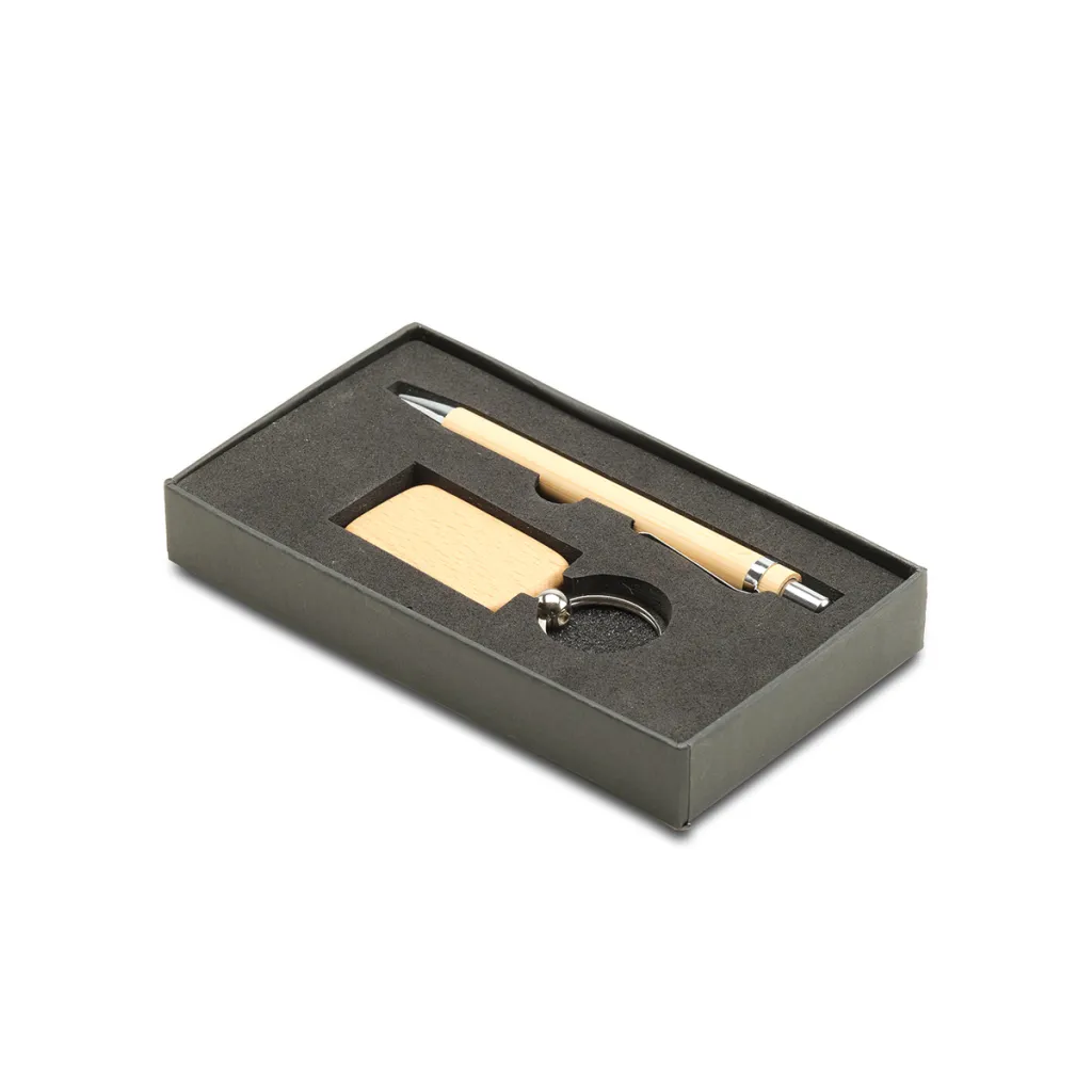 Keyring and ballpen set made of wood and metal, in a gift box.
