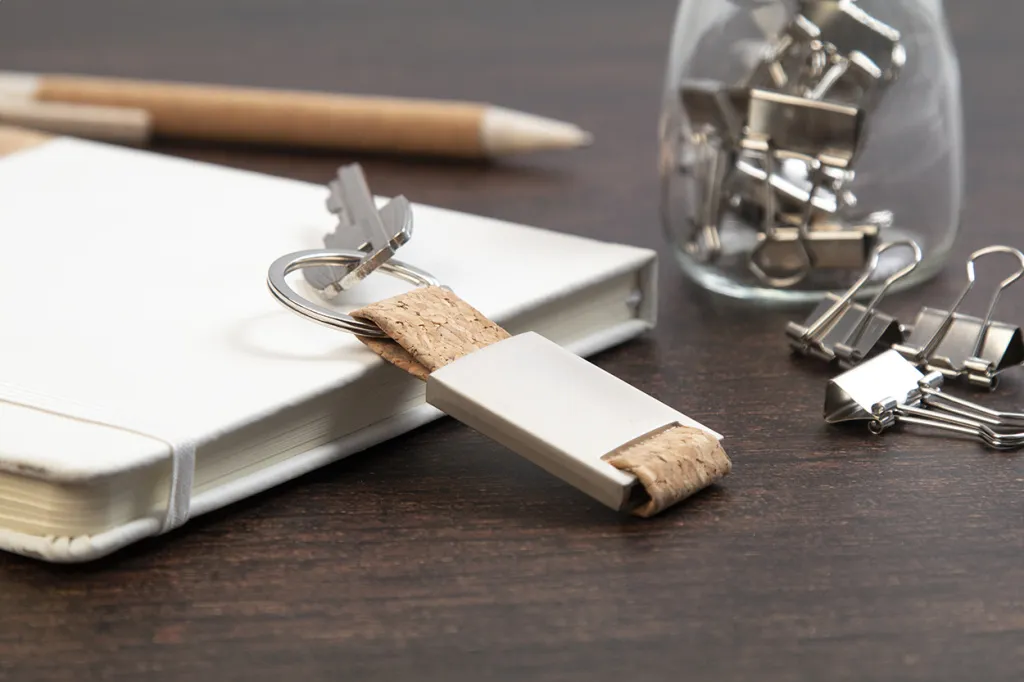 Rectangular metal keyring with natural cork strap and metal ring.