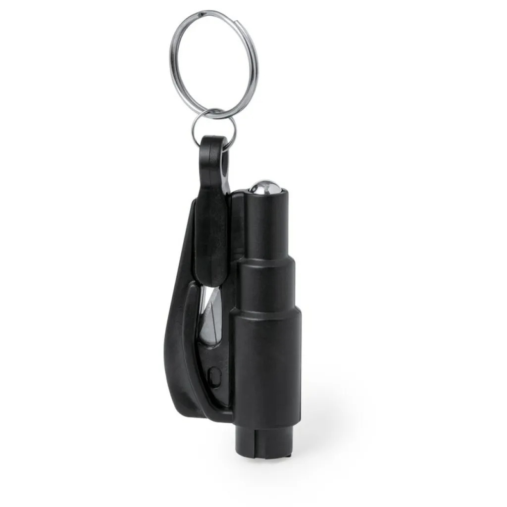 Keyring, seat belt cutter, safety hammer