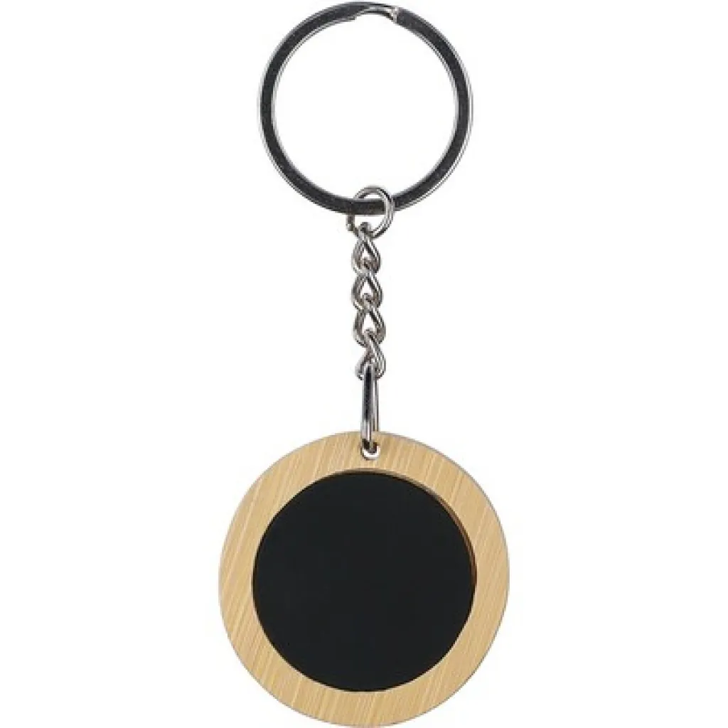 Keyring with black rubberized engraving plate, once engraved the logo will be visible in shiny chrome, packed in a brown carton envelope, product made from stainless steel and bamboo