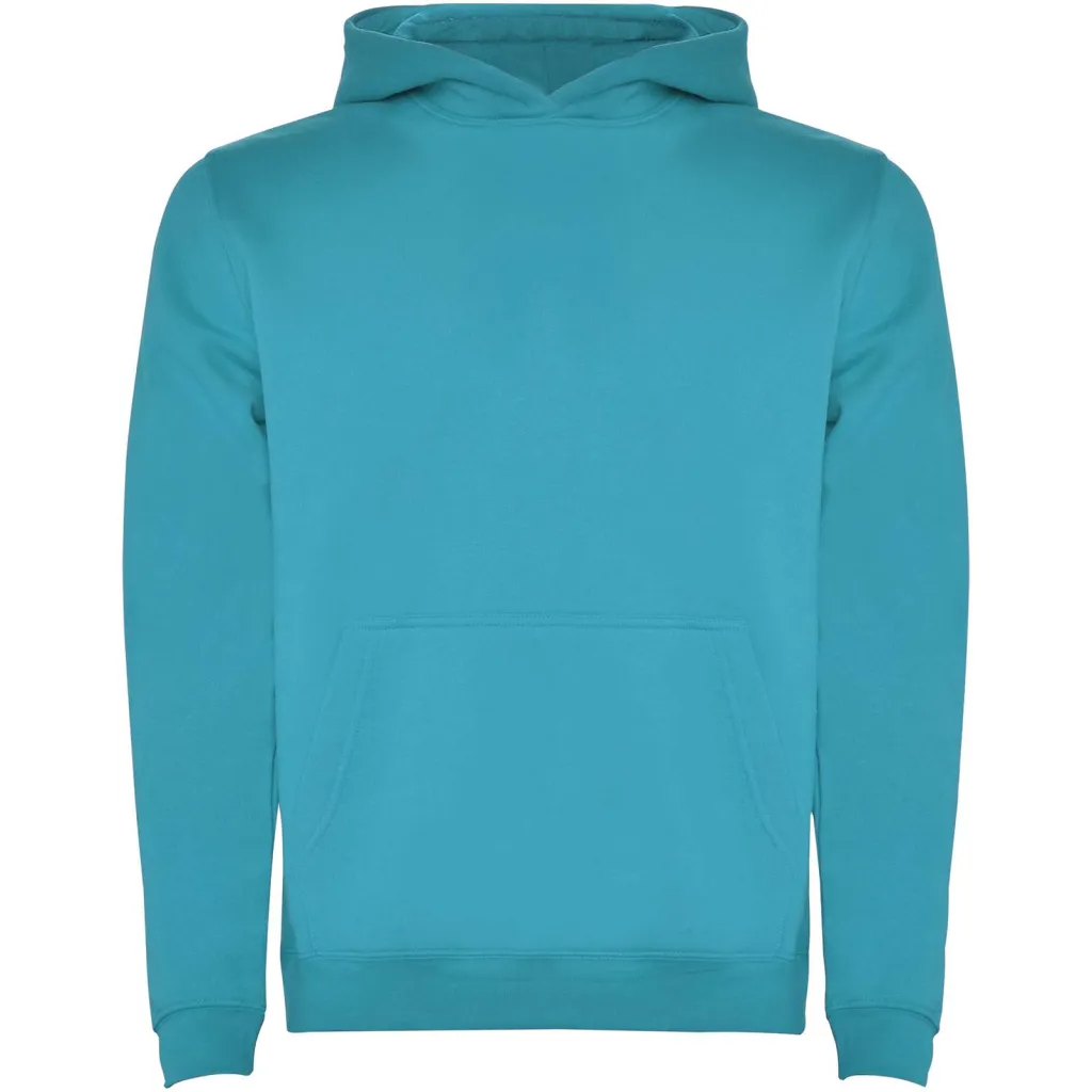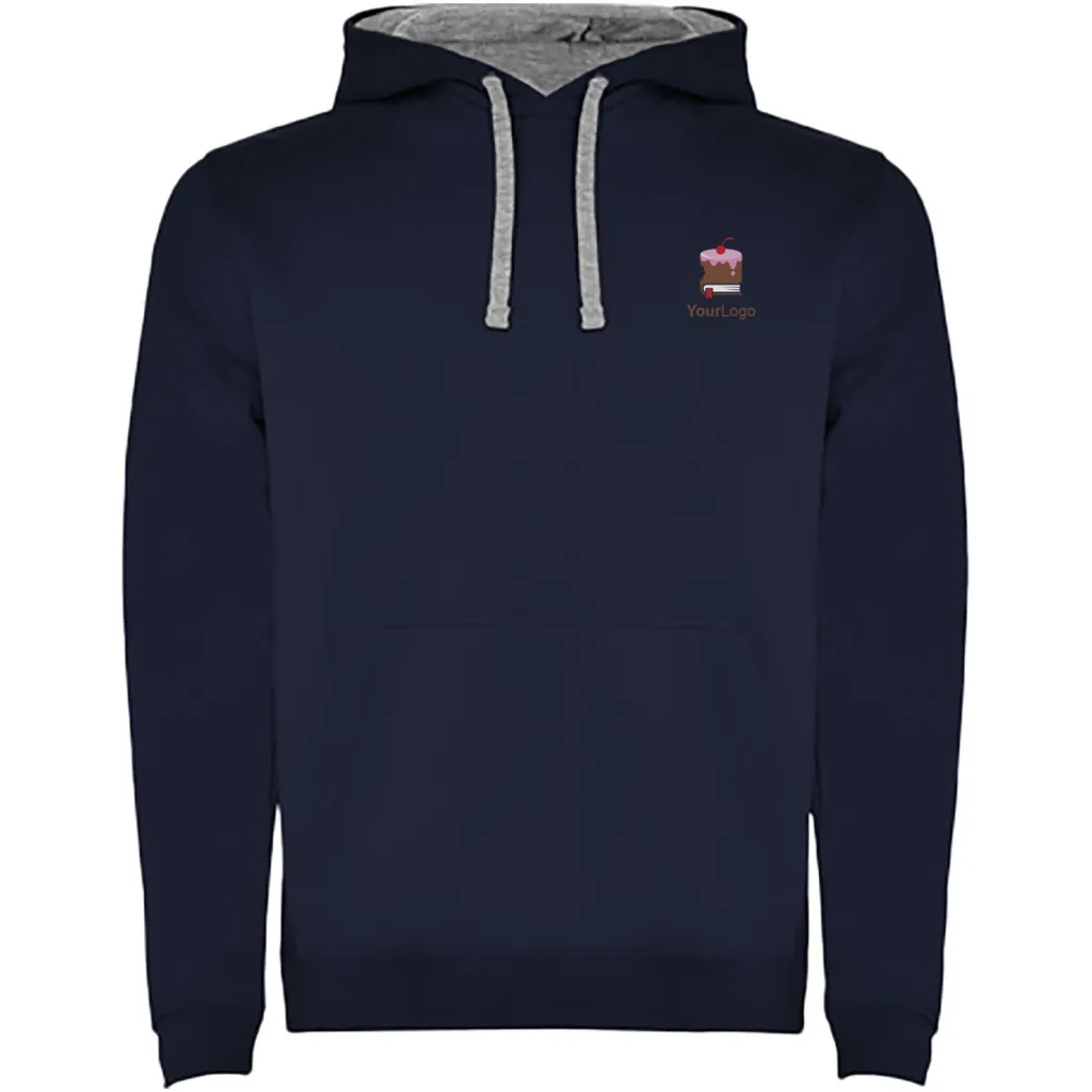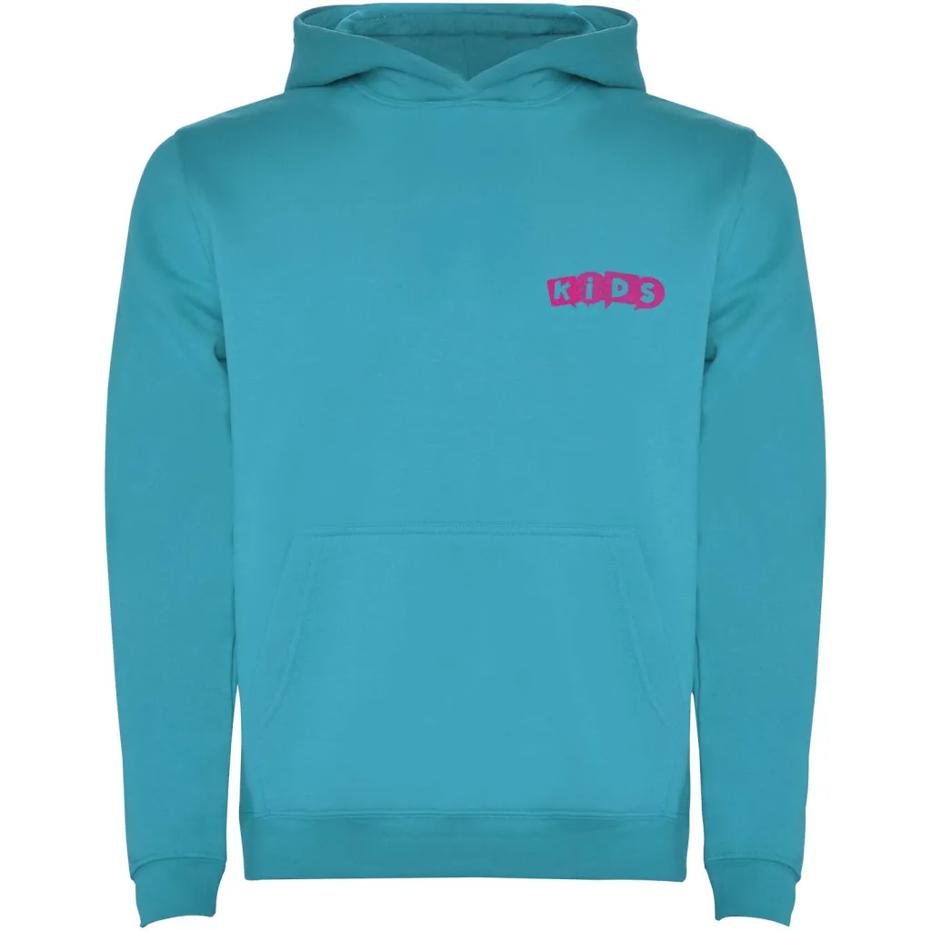 Two-colour hoodie with double fabric. Reinforced covered seams in collar and kangaroo style pocket. 1x1 elastane rib in cuffs and waistband. Removable label. The model is 120 cm and is wearing size 5/6.