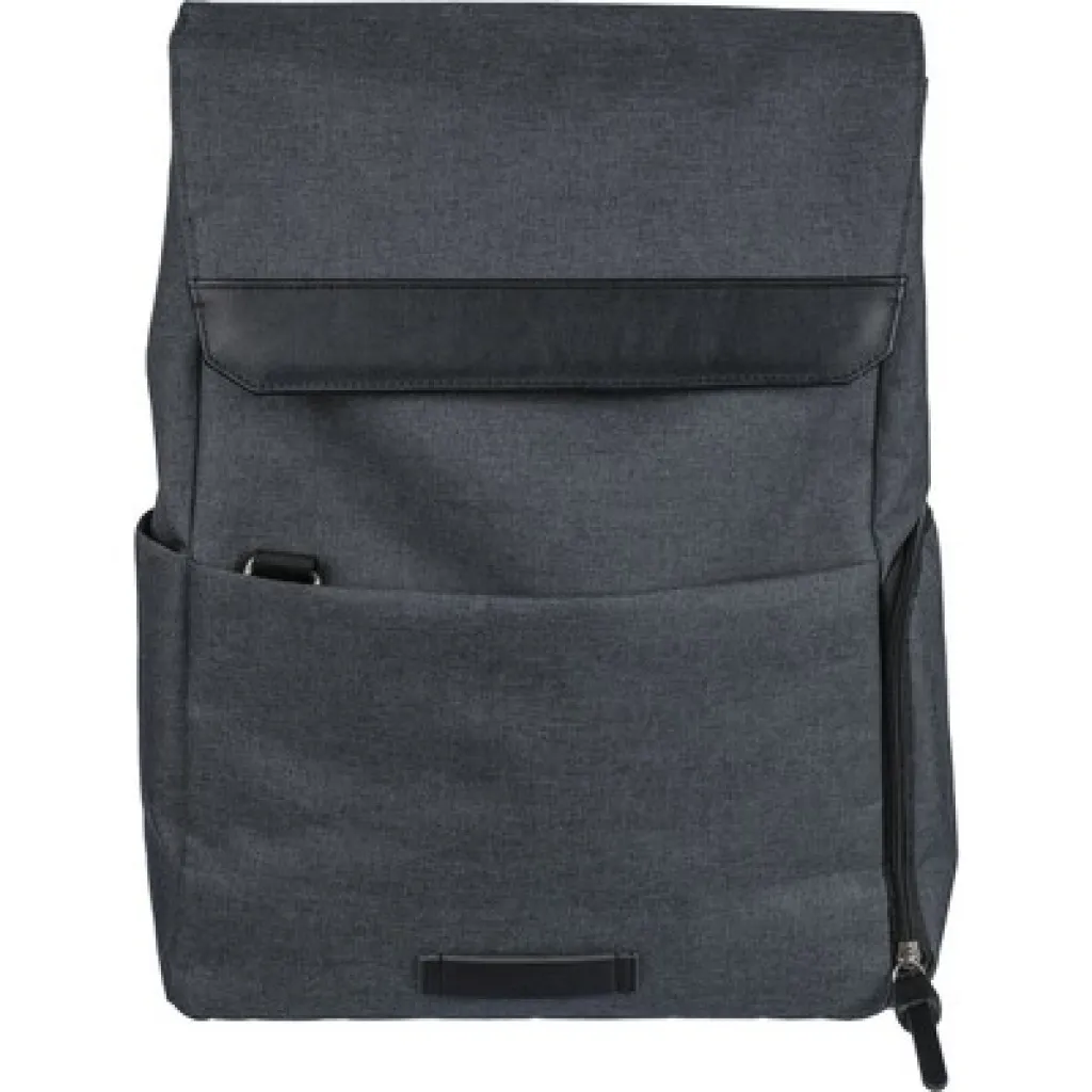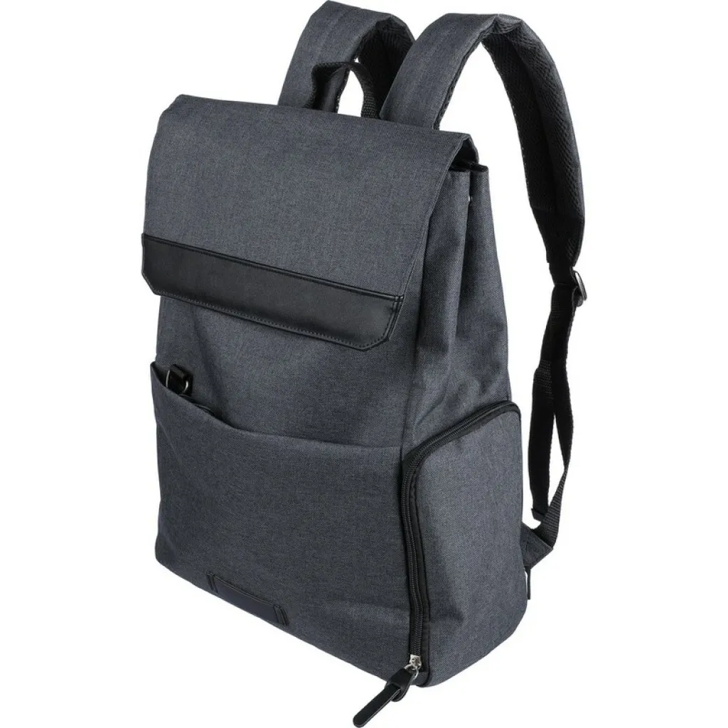 Laptop backpack 15" with lining, small front pocket with zipper, compartment with zipper on the side, regular side pocket, large compartment with magnetic closure with a laptop pocket, buttons on the side allow to close the backpack when it is not completely full, adjustable straps, holder top for hanging on a hanger, includes RPET icon on the tag, inside the zippered pocket at the front there is a ring and a carabiner for fastening keys and protects them against theft, product made from polyester canvas, polyester and PP