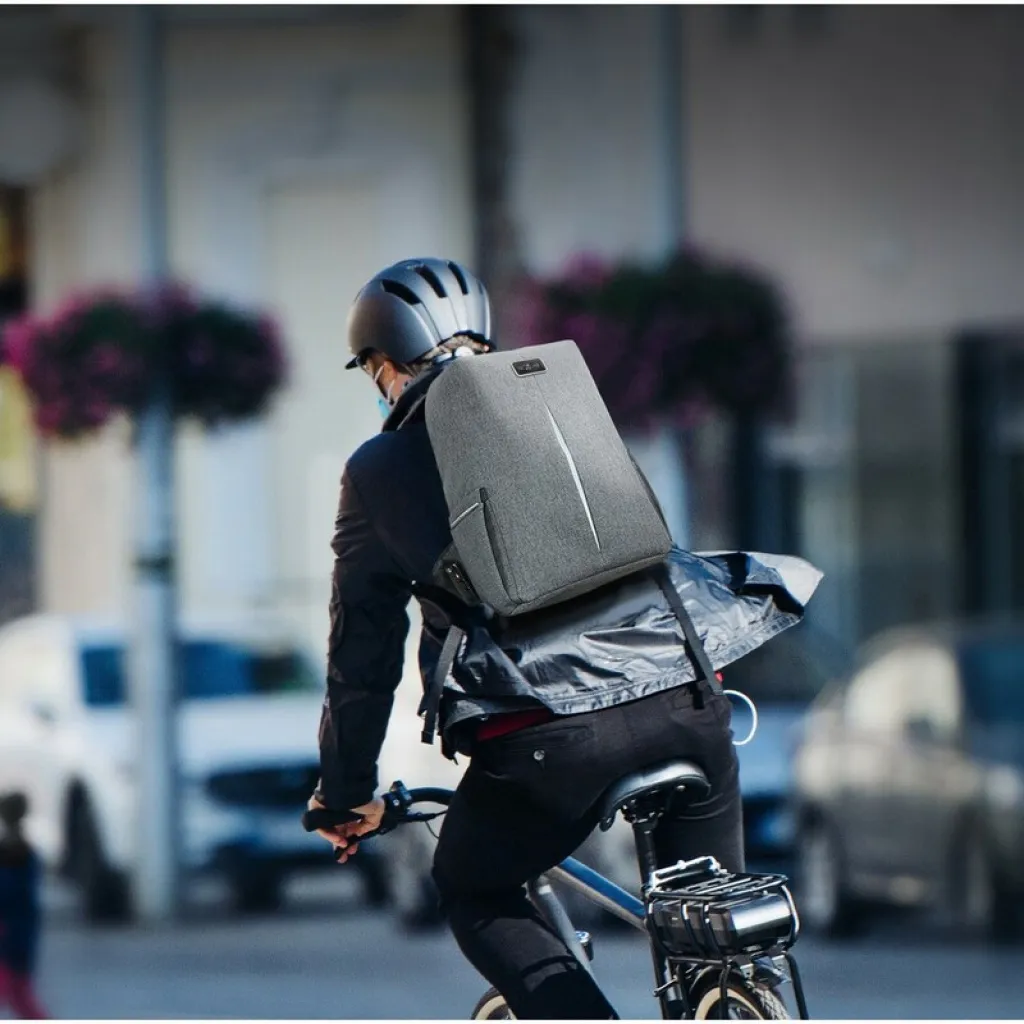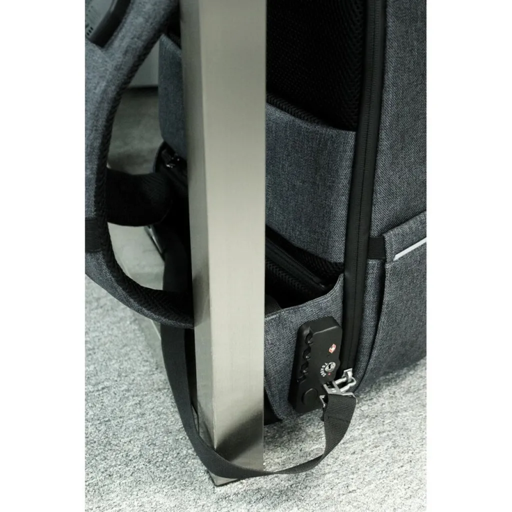 Laptop backpack 15,6" BrandCharger Phantom, features reflective detailing for nighttime safety, an integrated TSA lock to secure zippers and a 74-lug zipper to secure the bag with items to protect them from theft, hidden pockets, padded compartments for a 15.6" laptop" or 10" tablet, waterproof zipper, anti-theft compartments, padded back and buckle with a built-in bottle opener, product made from waterproof materials and polyester